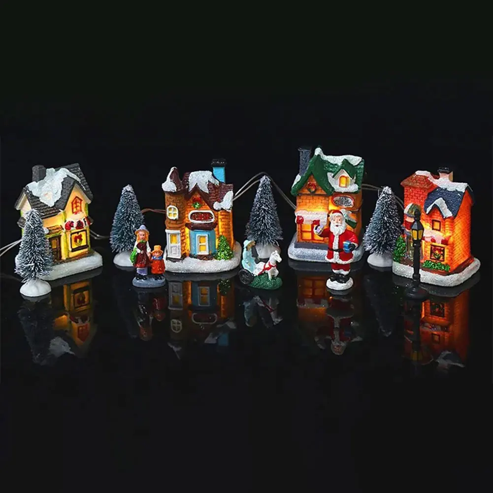 12 Pcs Mini Resin Christmas Town Set Battery Operated Lighted LED DIY Christmas Doll Figurines Christmas Trees Christmas Village