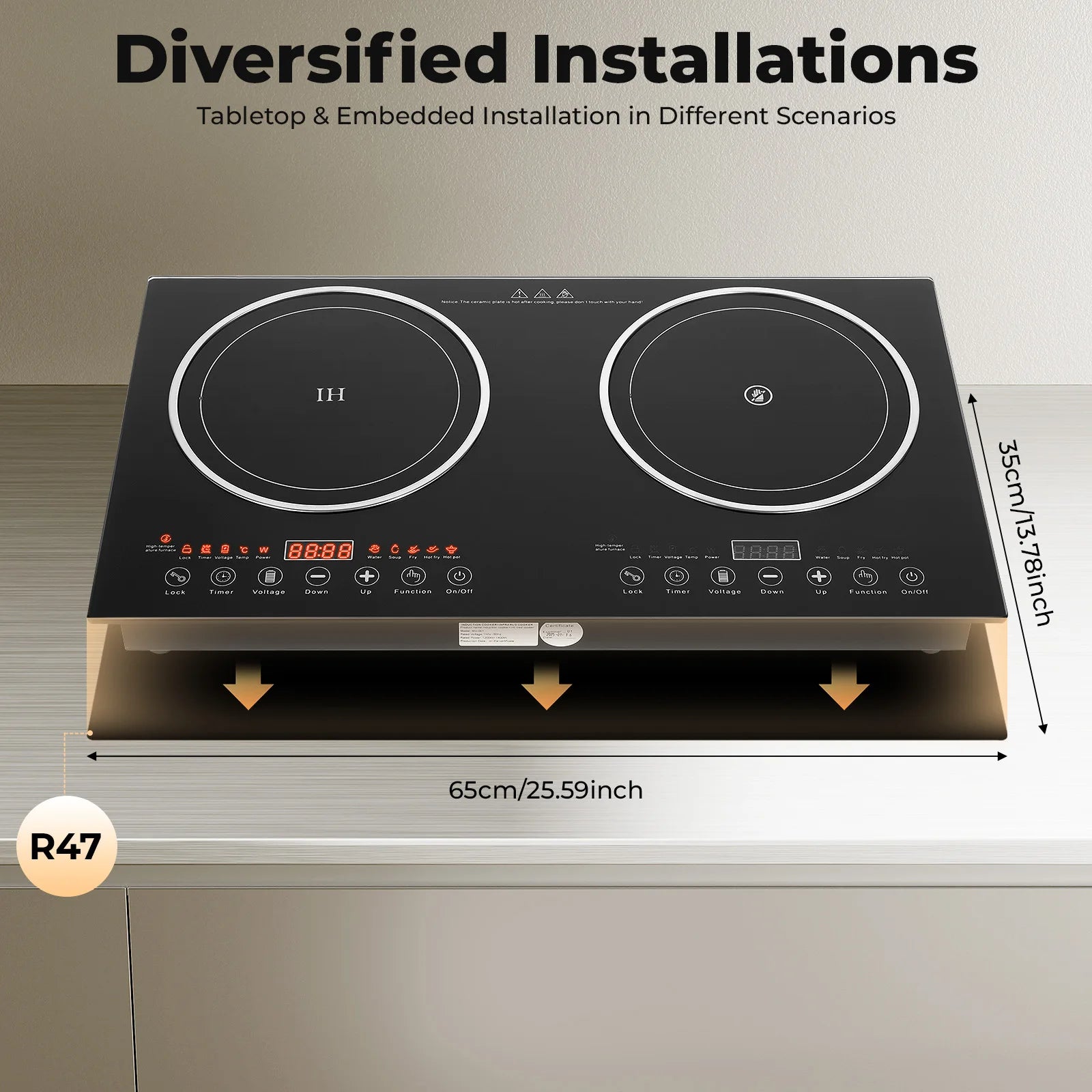 Quick Heating: With 2400W(1200W+1200W) high-power induction heating, this product can quickly reach your desired temperature to help you cook food quickly.