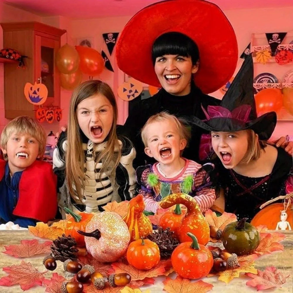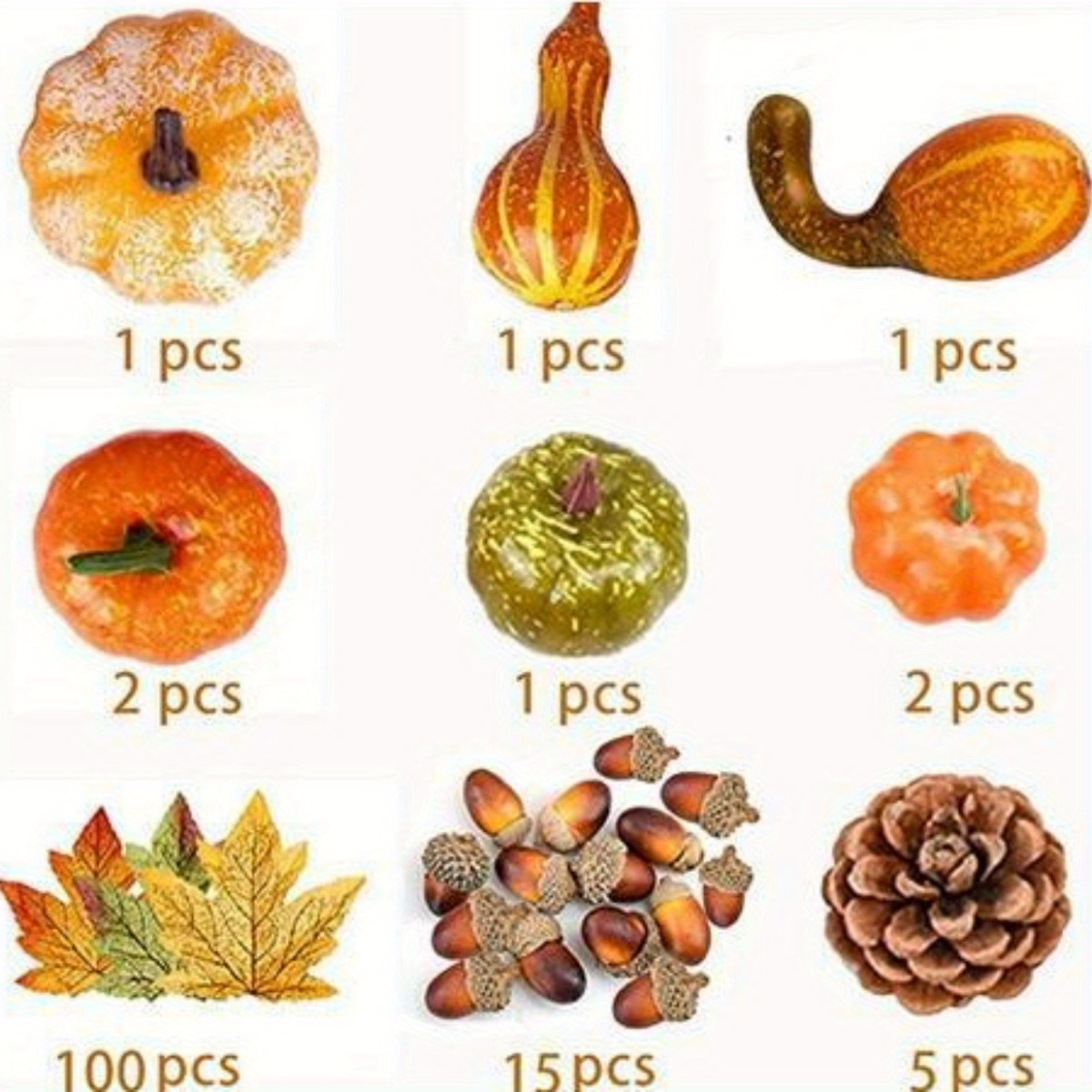 128 Pcs Thanksgiving Artificial Pumpkins Decorations Set with Maple Leaf, Foam Pumpkin, Small Acorns, Pine Cones and