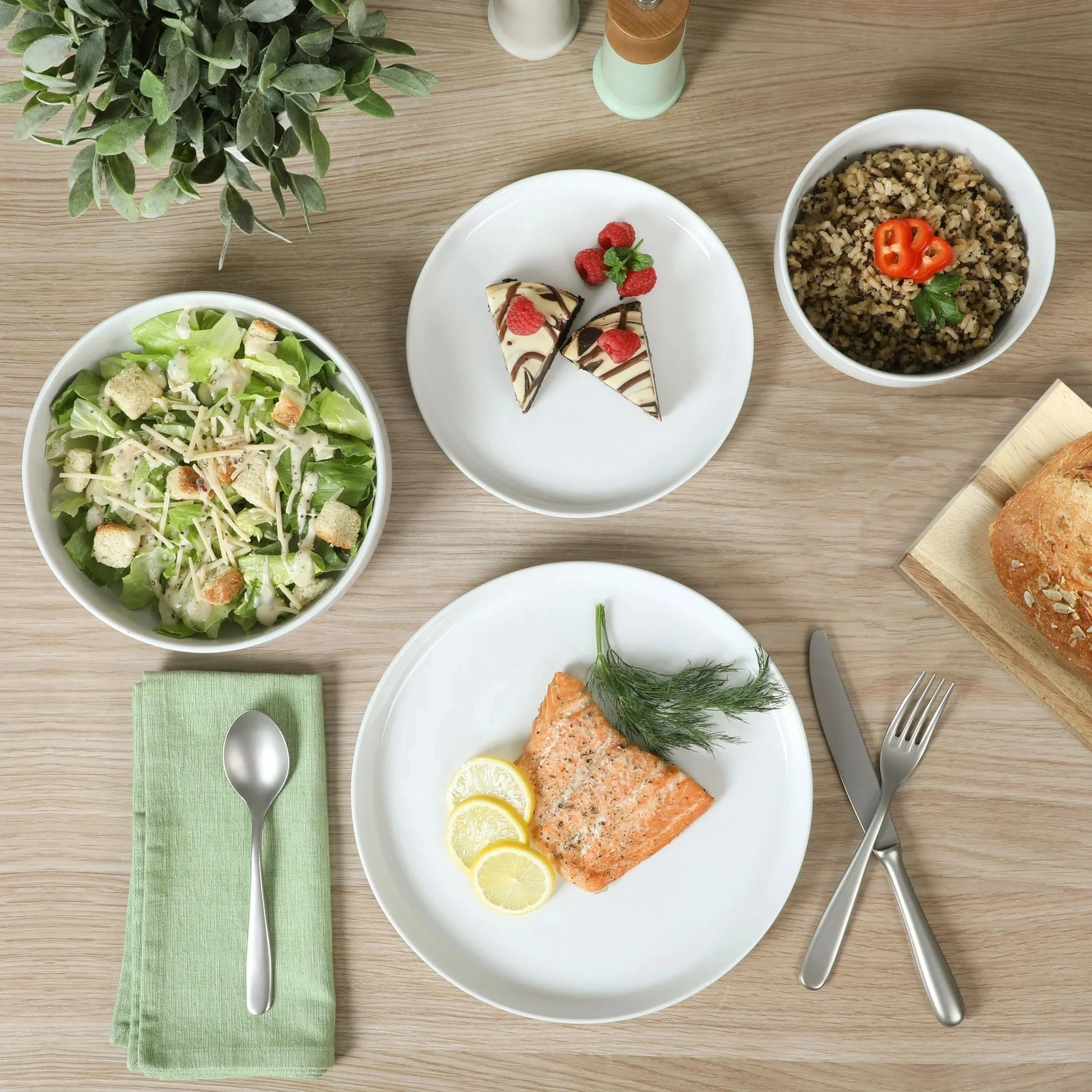 Versatile Dinner Bowls: The dinner bowls combine the spacious base of a plate with the low, curved sides of a bowl, ideal for serving full meals, stews, and soups.
