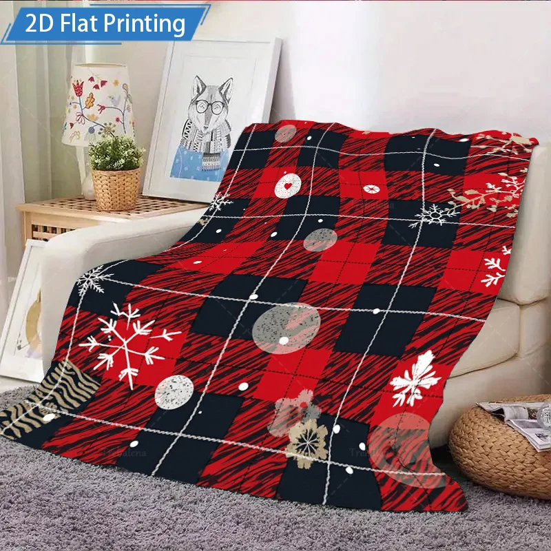 1pc Flannel Blanket Christmas Plaid Fleece Blanket with Snowflakes and Hearts - Cozy Holiday Decor