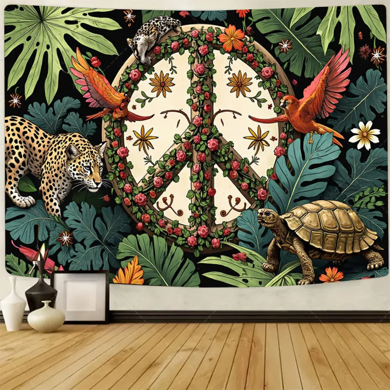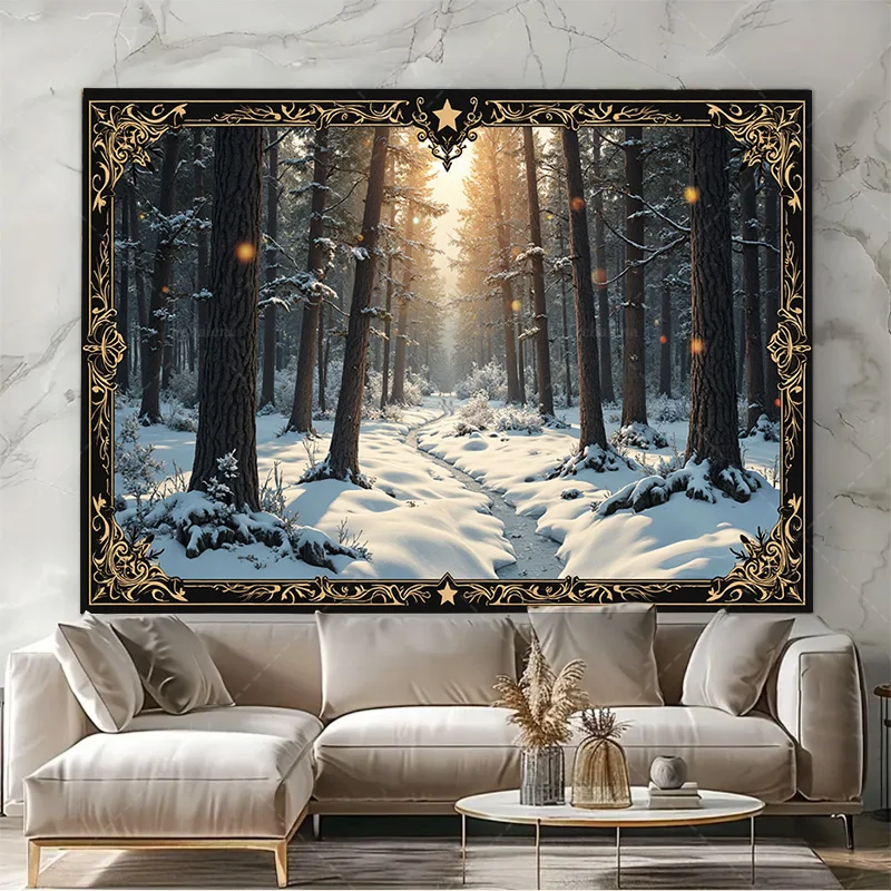 1pc Wall Tapestry Enchanted Winter Forest Tapestry - Golden Frame, Snowy Path, Cozy Cabin Decor