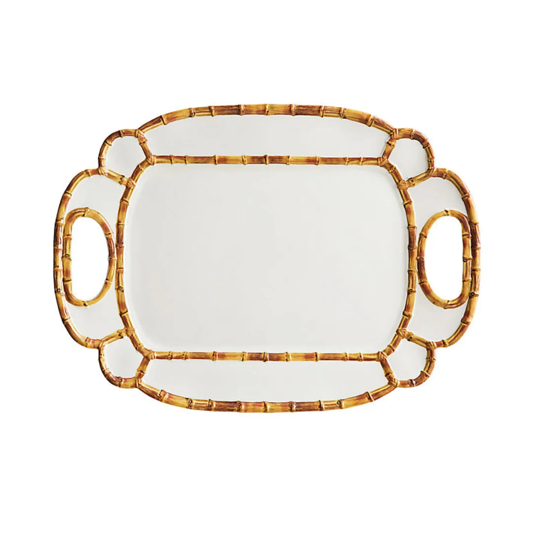 A tropical touch of color and texture for your table or buffet, indoors and out. Our Tray is made of heavy-weight, shatterproof melamine with pretty, scalloped edges and hand painted bamboo details. This kid-friendly platter is perfect for serving family-style on the porch, patio or by the pool. The fresh white ground makes it easy to layer Jacqueline with your favorite table decor.