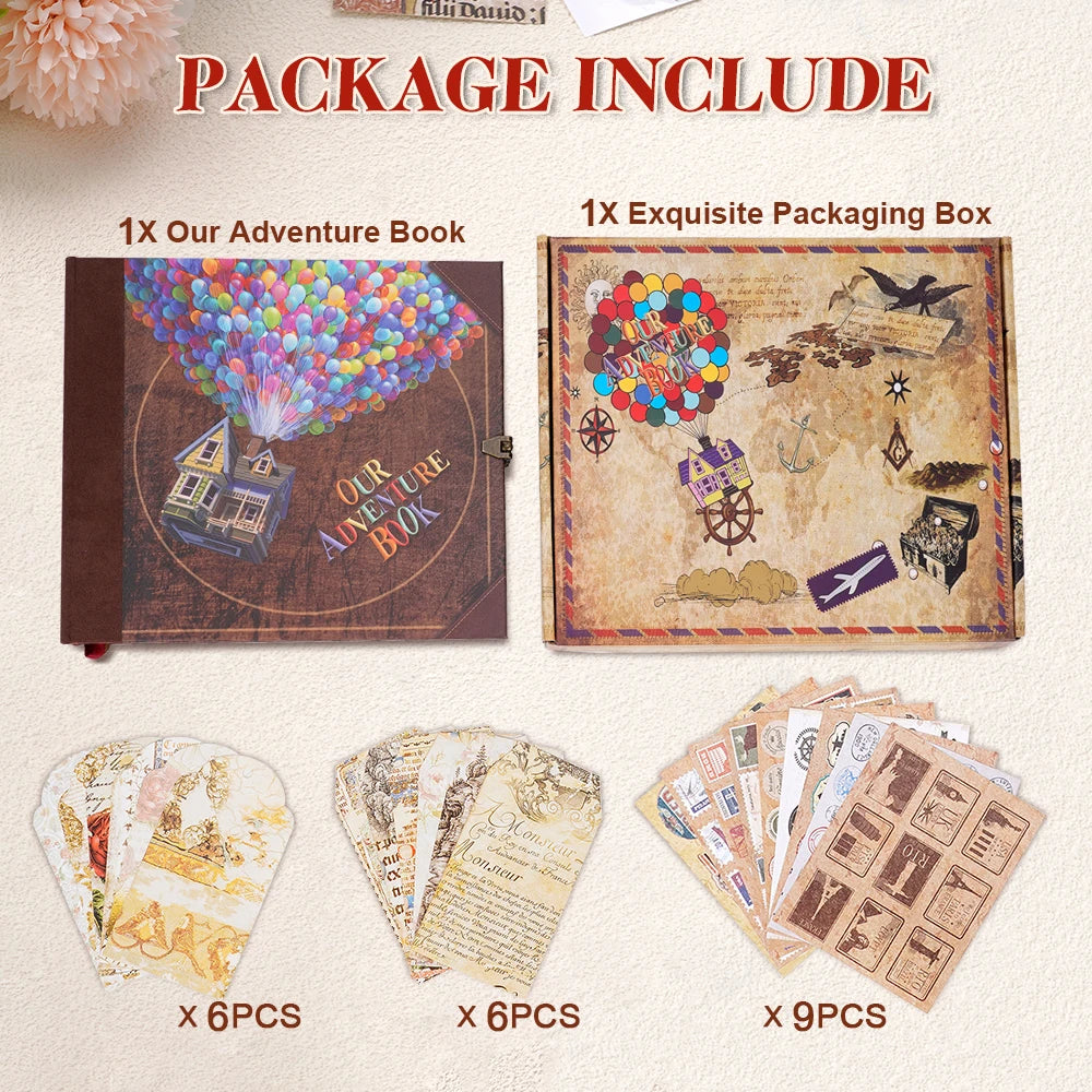 Bonus Accessories: Each book comes with Pixar UP movie themed accessories. You'll receive 8 post cards collections, photo corner stickers, as well as UP Russell and Carl Character, enhancing the charm of the book.