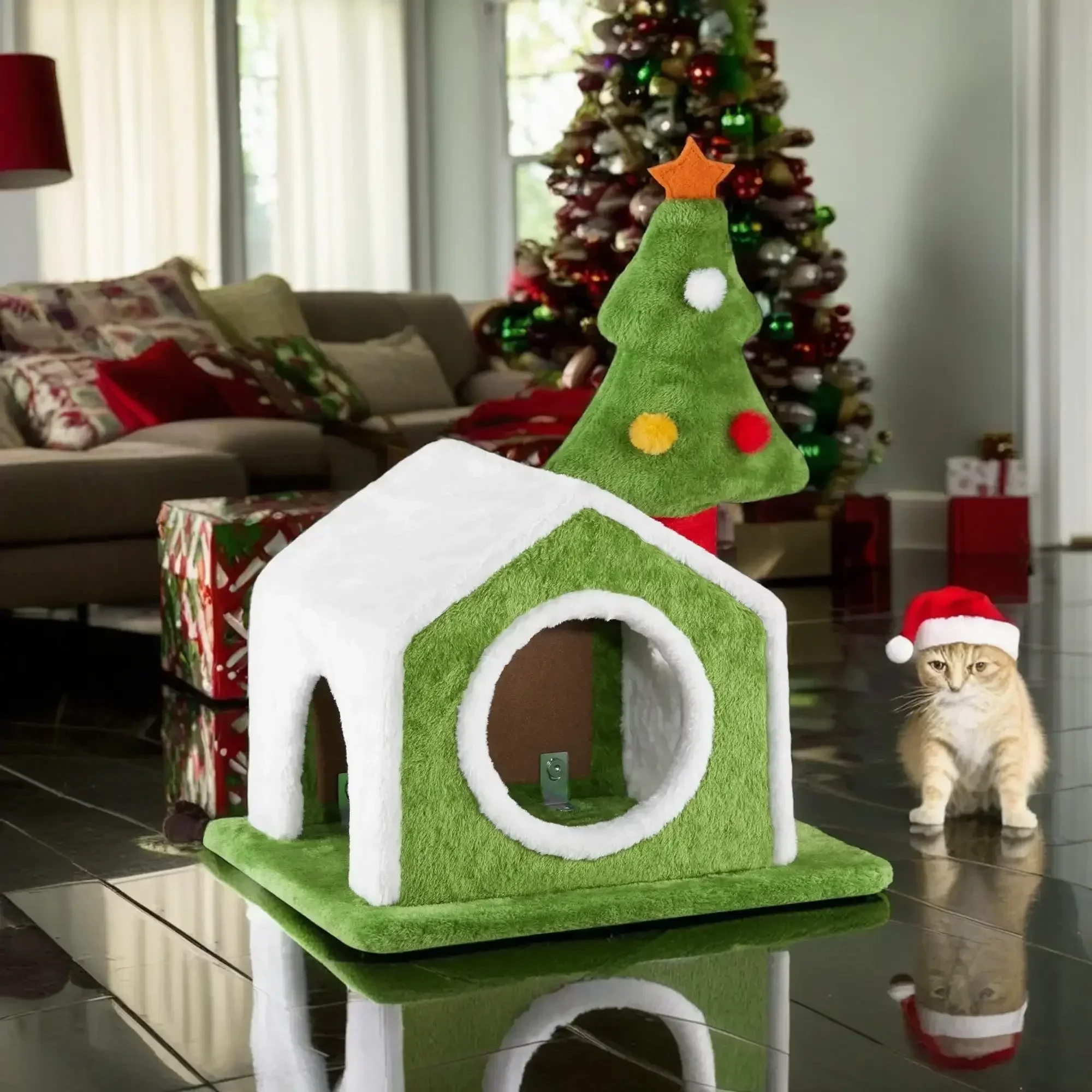 1. Festive Christmas Design: Featuring festive colors and a cute plush Christmas tree, this cat house serves as both a cozy bed for your cat and an adorable holiday decoration, inviting your furry friend to be part of the seasonal fun.