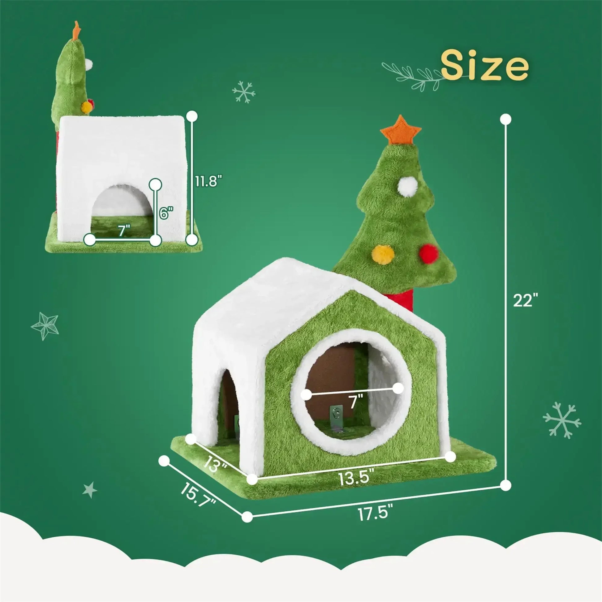 Give your cat the perfect festive retreat with this 24-inch Christmas Cat House. Designed with vibrant holiday colors and a cute plush Christmas tree decor, this cat bed doubles as both a cozy hideaway for your feline friend and a charming addition to your holiday decorations. The soft plush materials provide a comfortable space for your cat to rest, while the two entrances allow easy access for play and exploration. This cat house is the perfect way to involve your pet in the holiday cheer while ensuring they have a snug and safe place to relax.
