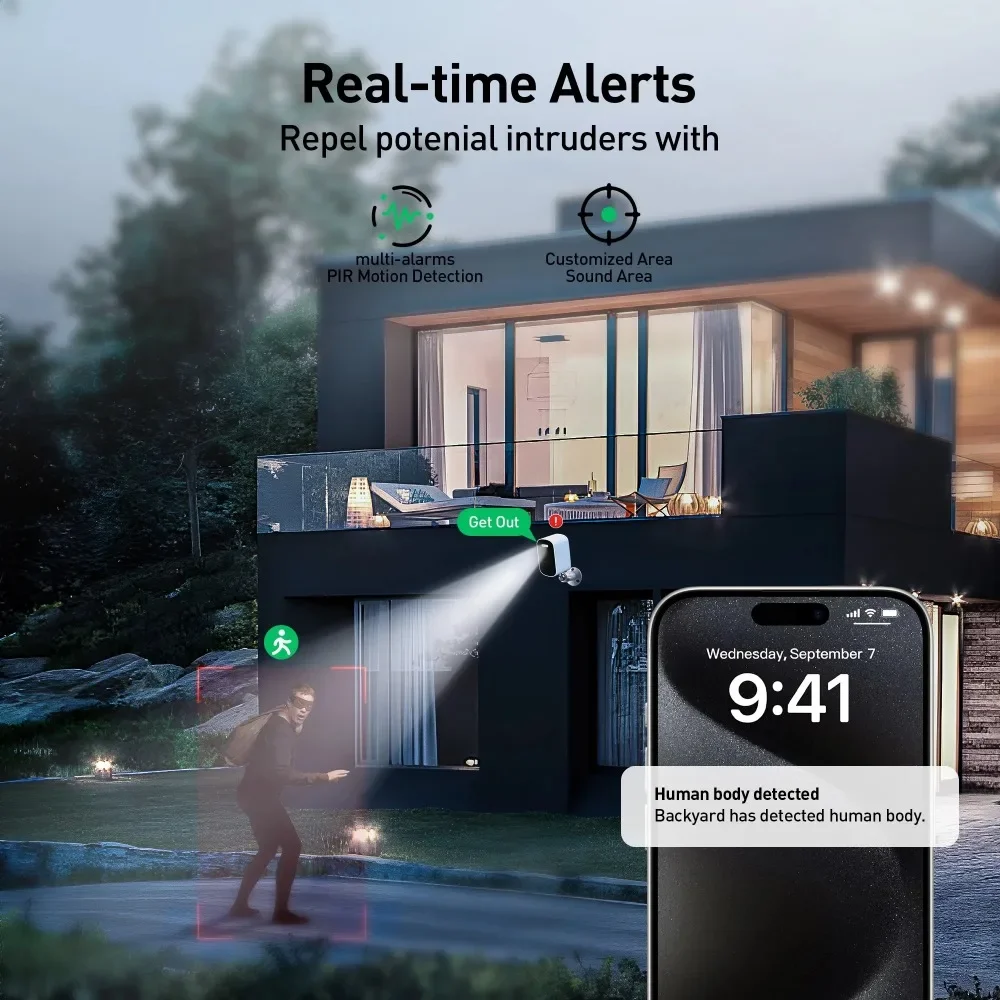 Two Talk Way & Privacy Guaranteed:Security cameras wireless outdoor built-in microphone and speaker allow you to see, hear, and speak to anyone who passes by via the Wi-Fi camera with live view and two-way audio features. Video and audio is transmitted via a secure channel with HTTPS technology ensuring no data is shared publicly through the Internet and no outside devices can access your Indoor Camera.