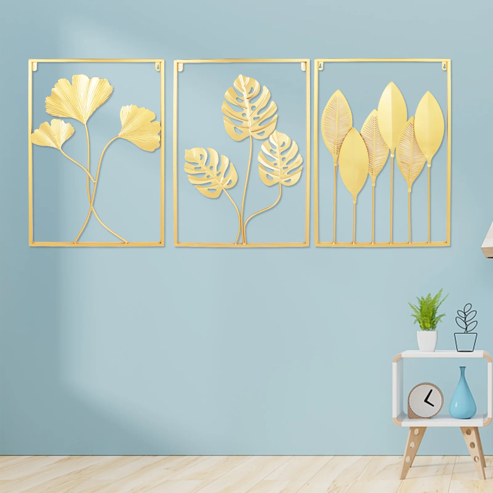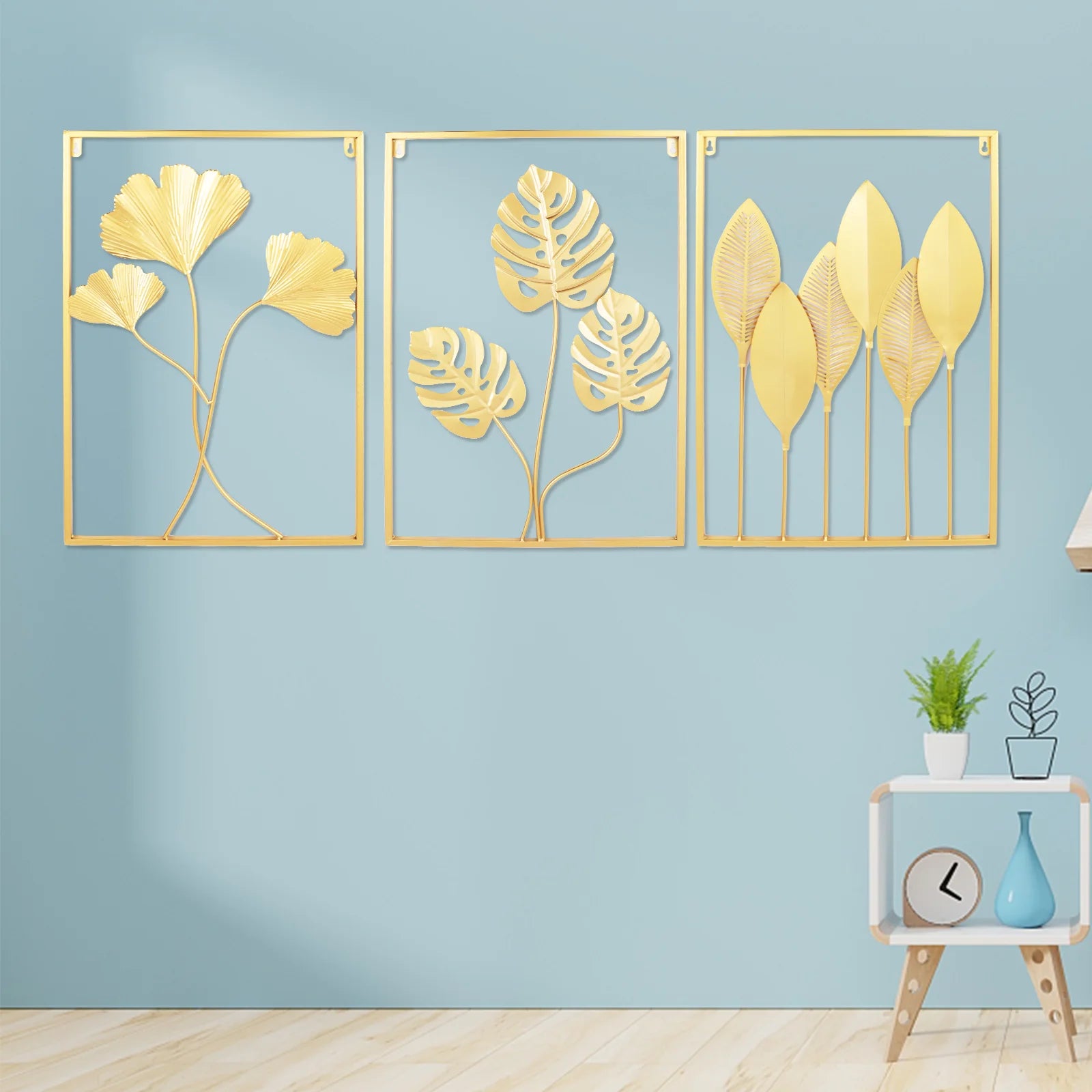3 Pack Gold Metal Wall Art for Living Room, Large Leaf Frame Accent Leaves Wall Decor Home