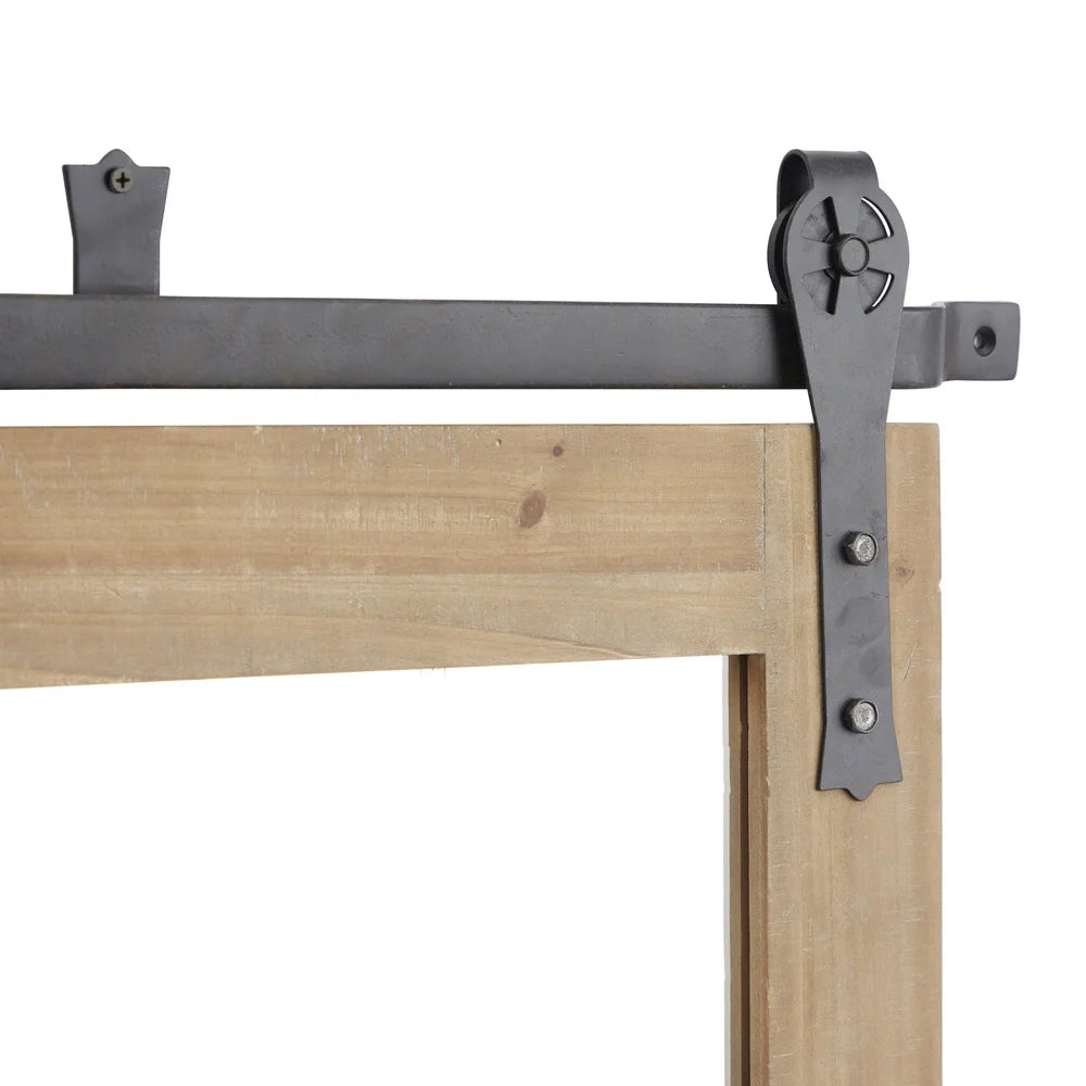 The black metal bracket and hanging wheel set complement the natural wood brown frame of this wall mirror for an elegantly industrial aesthetic vibe
