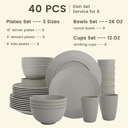 40-Piece Wheat Straw Dinnerware Sets, Non Breakable Dinnerware, Cups, Plates And Bowls Sets For 8 - Microwave Dishwasher Freezer Safe, Grey