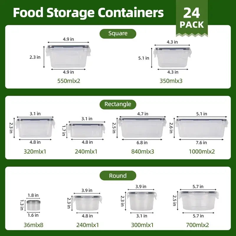 PERFECT SIZE FOR ALL YOUR STORAGE NEEDS: This 50-piece food containers set includes 24 containers and 24 lids of different sizes to meet different kitchen storage needs.Plus, sticky labels and chalk pen. Rectangular (320mlx1,240mlx1,840mlx3, 1000mlx2); Square (550mlx2, 350mlx3); Round (36mlx8, 240mlx1, 300mlx1, 700mlx2)(Note that 8 of the smaller sized boxes are suitable for sauces)