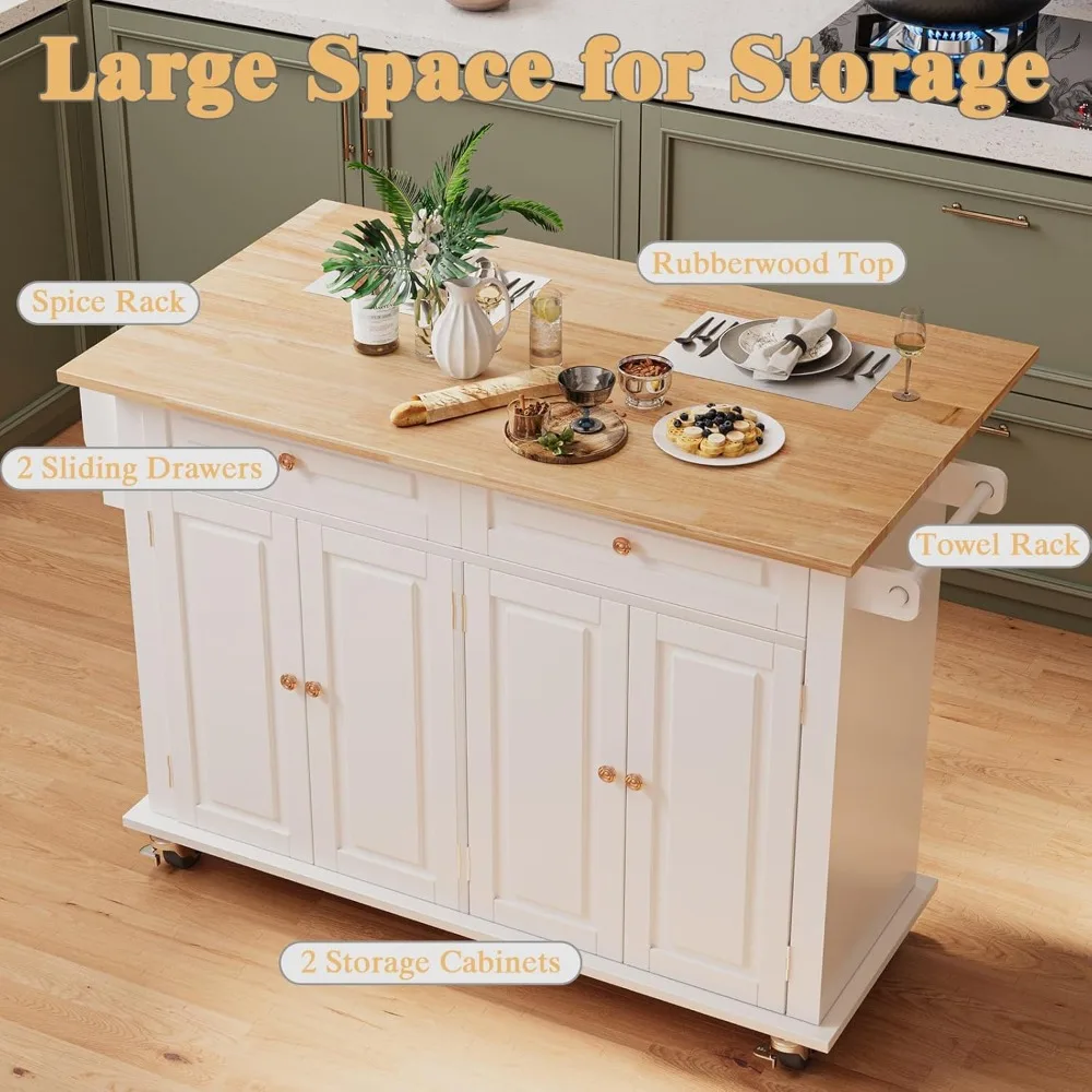 - AMPLE STORAGE Kitchen islands come with drawers, cabinets and shelves that provide plenty of storage space and make it easy to organize your kitchen. Drawers for utensils and crockery; spice and towel racks for easy access; cabinets for microwaves, toasters and other small appliances