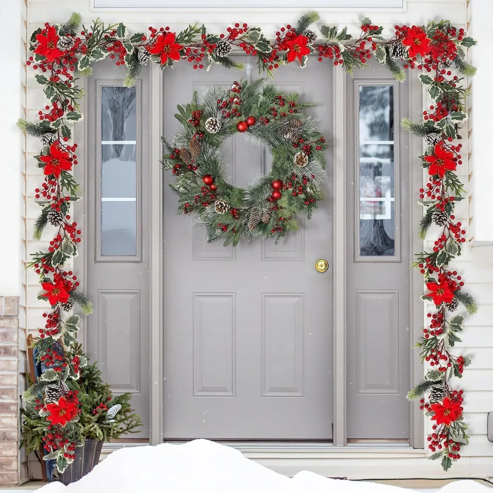 - 🎄🎅【Widely Applicable Occasions】--With rich red berries and realistic poinsettias, this Christmas garland is sure to bring you holiday cheer no matter what room you put it in. You can wrap it around your Christmas tree or hang it on your door frame. Or as home, fireplace, dining table, door frame, courtyard, garden, porch, stair railing, Christmas tree decoration.