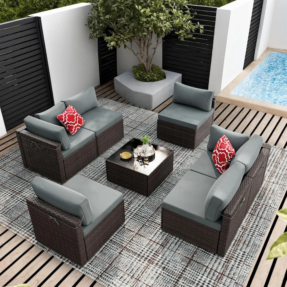 7 Pieces Patio Furniture Sets, Outdoor All-Weather Sectional Patio Sofa Set PE Rattan Manual Weaving Wicker Patio Conversation