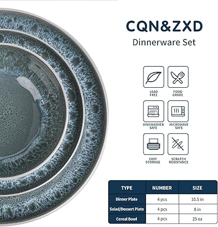 What Will You Get: 12 Pieces Stoneware Dish Set For 4 Ludes 4 X 10.5 H Steak/Pasta Plates, 4 X 8 H Salad/Dessert Plates And 4 X 25 Oz Cereal Bowls. Fully Meet The Dining Needs Of Individuals, Couples, And Families, As Well As The Needs Of Various Such As Festivals, Anniversaries, And Parties.