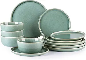 Ceramic Dinnerware Sets For 4, 12 Pieces Stoneware Plates And Bowls Sets, Scratch Resistant Dishes, Dishwasher & Microwave Safe, Reactive Glaze-Malachite Green