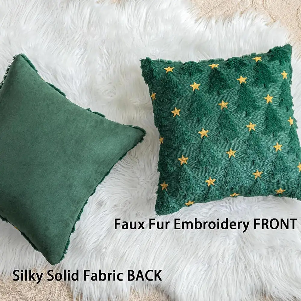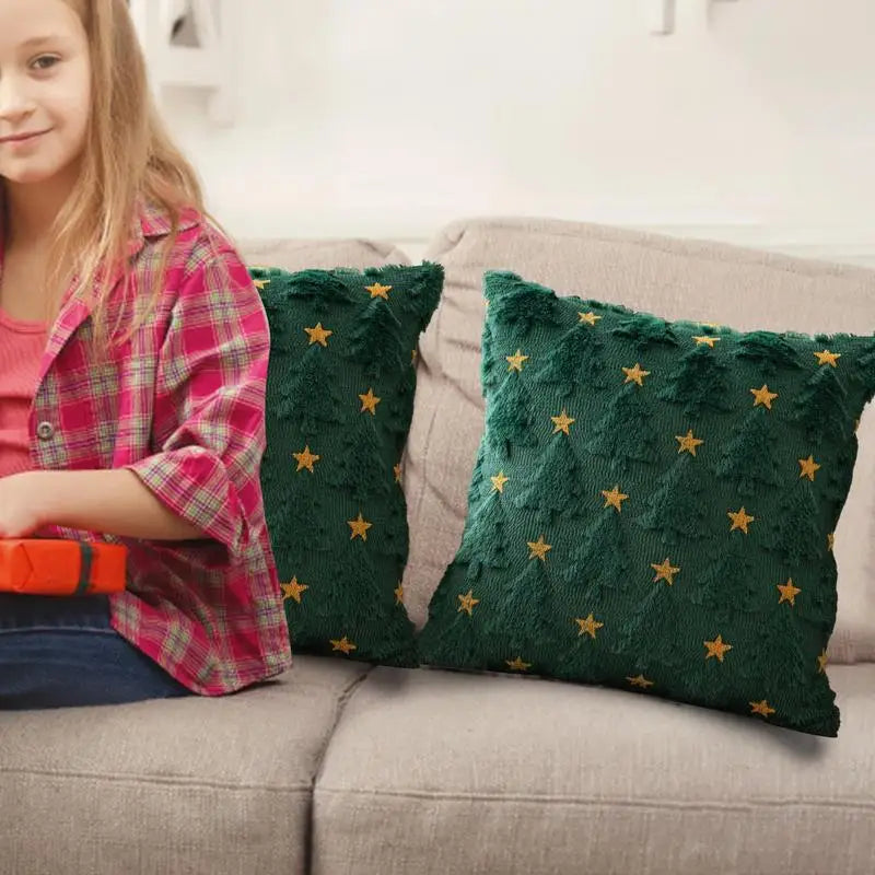 2.Delicate Look: Lift your festive decor with this Christmas pillowcase. 3D embroidery and tactile textures create a sensory experience, as stars embroidered with yellow yarn elegantly suspend atop a abundant green tree