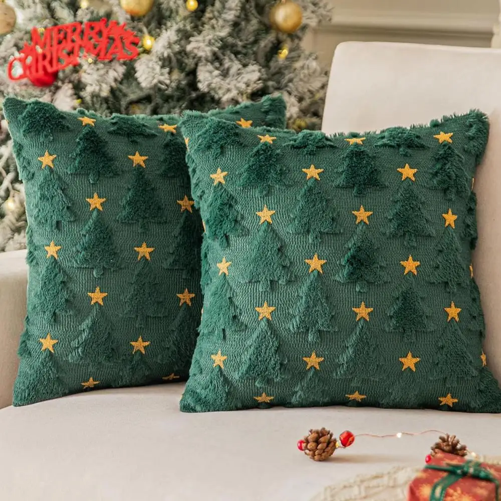 Christmas Cushion Covers Green Christmas Tree With Golden Star Square Pillowcase Holiday Home Decoration Winter Holiday Soft