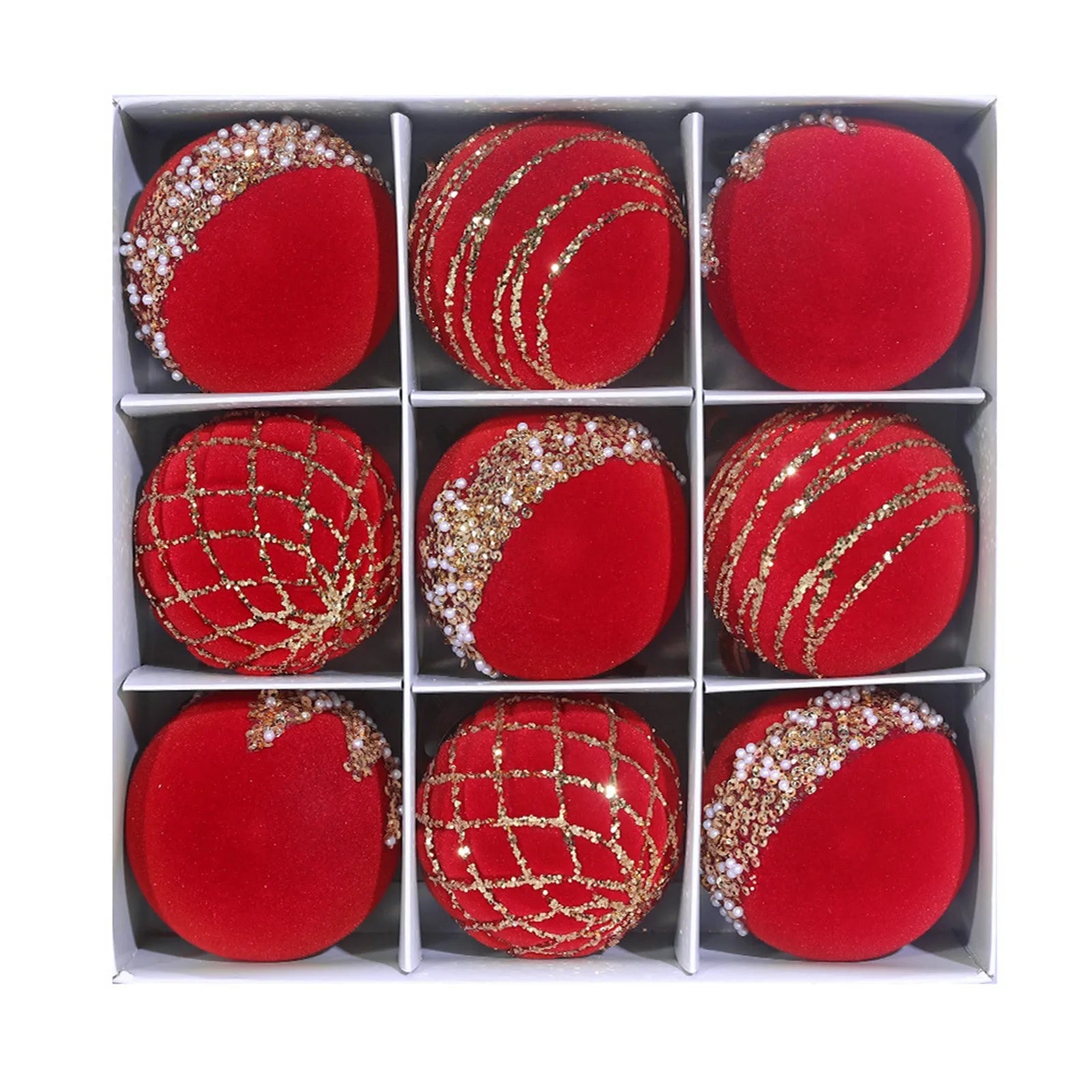 Christmas Ornament Red Gold Patterned Flocked Plastic 8cm 9pcs Christmas Tree Decor Festive Home Xmas Ball Set Accessory