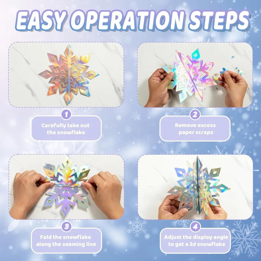 - Super Value Set: This pack includes 12pcs white snowflakes and 12pcs laser iridescent snowflakes in three different sizes. By simply folding along the sewn seam, you can create beautiful 3D hanging snowflakes. Their intricate white and laser designs reflect light wonderfully, adding an elegant and mesmerizing touch to your indoor holiday decorations
