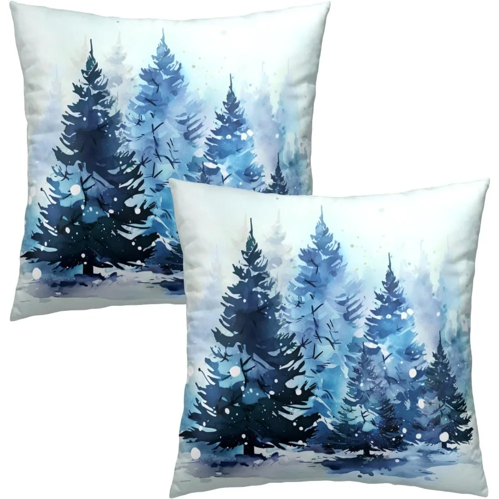 Christmas Throw Pillow Covers 18x18 Set of 2, Rustic Winter Blue Trees Snows Pine Forest Farmhouse Decorative Pillow Cases Cotto