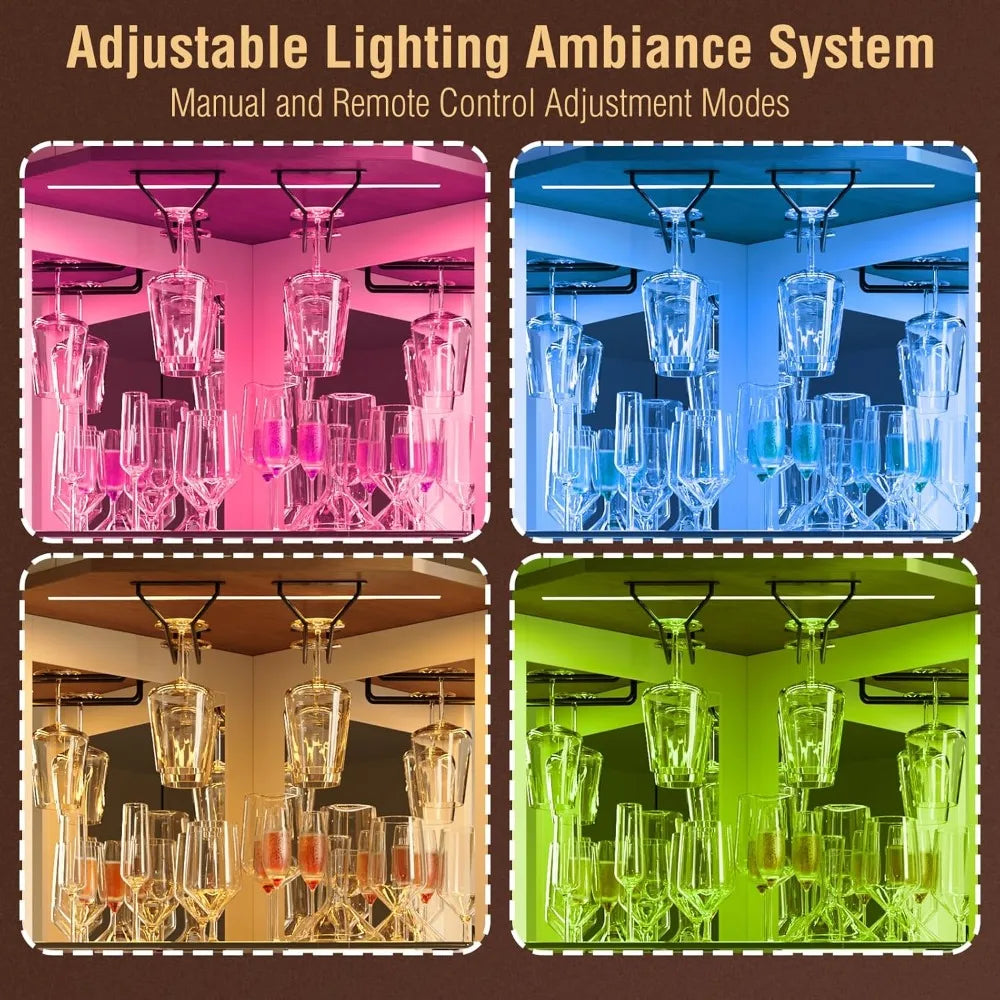 - Enjoy your private home bars:This high bar cabinet with RGB LED corner light bars strips creates a relaxed and cheerful atmosphere in your room, perfect for wine tastings, parties or displaying your wine collection. The soft light illuminates the goblets and bottles, making it easy to find what you need without fumbling around in the dark.