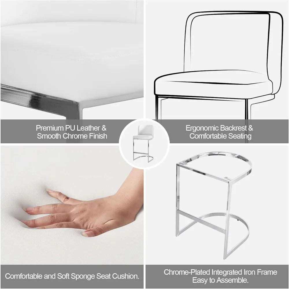 【Contemporary Style】Choose between faux leather or velvet seating in this 26" modern counter stool, enhanced by a sleek chrome-plated finish for a touch of sophistication. While the bar chair is available in four stylish colors: pu leather white, velvet cream white, velvet blue, and pu leather black. Whether you prefer the luxurious feel of velvet or the sleek look of PU leather, these bar chairs cater to different modern styles and individual tastes. 【Sturdy Cantilevered Base】Constructed with a widened and thickened one-piece iron base treated with electroplating technology, this stool can support up to 300lbs. With its cantilevered design the counter height stools offer a flexible and comfortable seating experience, allowing the seat to move slightly with the person's weight. Experience the benefits of comfort, space-saving, modern design, and durability with these modern cantilevered stools 【Ergonomic and Padded Seating】Our 26" kitchen island stools features an ergonomic curved back and 1.97" high-elastic sponge padding seat for optimal comfort and resilience. Designed for daily use and long-lasting satisfaction. With great lumbar support and a waistline fit, it relieves stress and offers added comfort. The 26-inch seat height enables easy seating, while the built-in footrest and plastic glides on the bottom to protect your floors. Suitable for counter height of 34"-40". 【Modern Decor & Versatile Use】 Dimension: Seat height: 26", Total height: 37.4", Seat Width x Depth: 18.9" x 16.54", Height of Backrest : 11.22"; Crafted in silver finish with PU leather or velvet upholstery and unique curvaceous design, it is a perfect combination of modern and classic style, brightening up your space instantly, suitable for kitchen island, dining room, home bar, rest area, pub and office etc. 【Easy to Assemble & Clean】 The set of 3 bar stools with simple structure consists of two parts: the seat and the base. Its package includes all the parts and accessories. Just need to tighten 4 screws, and finish the whole assembly in 10 minutes. Damp cloth for spot cleaning and any scratches can be easily buffed out, making maintenance hassle-free.