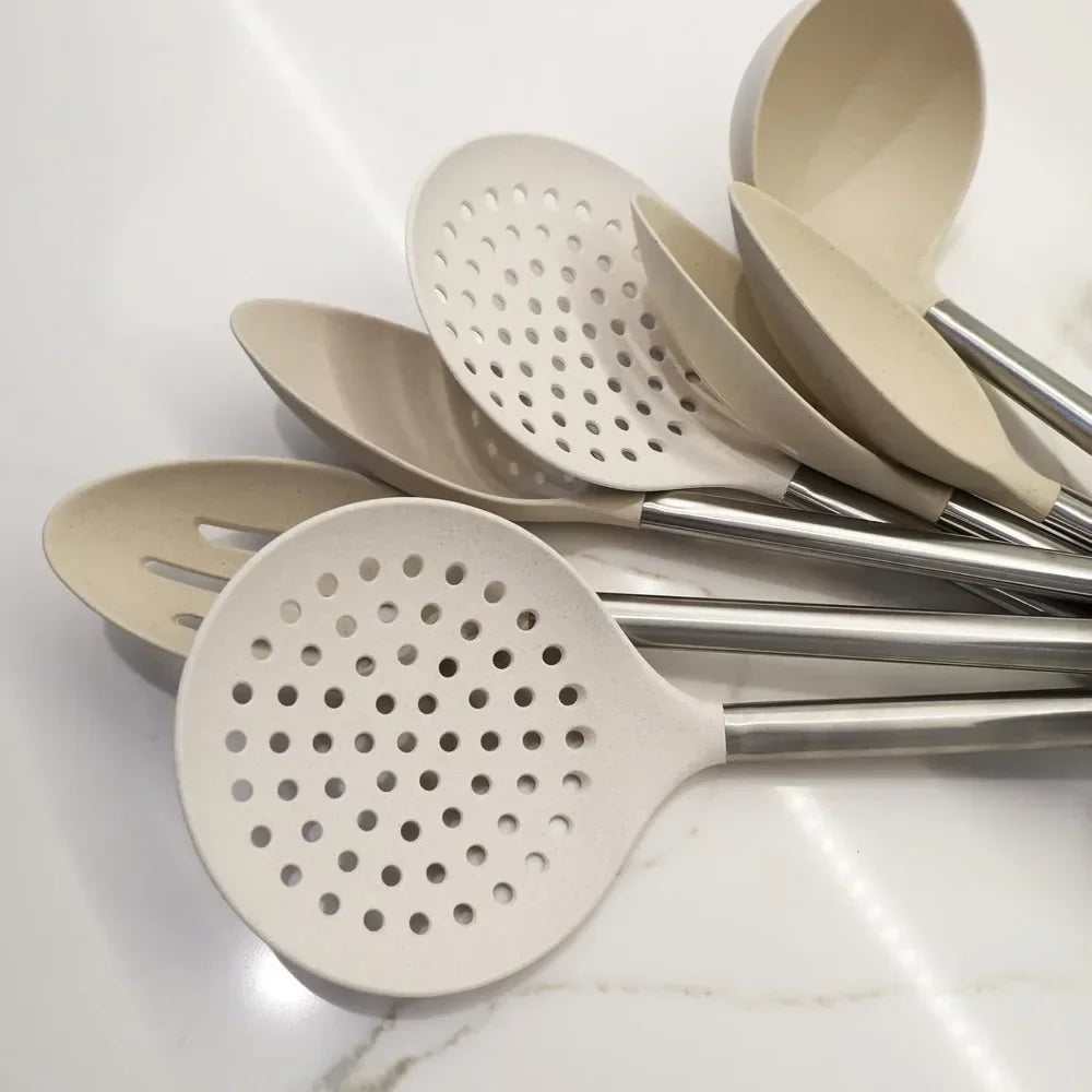 - SOLID AND DURABLE: wheat straw large spoon mimics traditional plastic cooking spoons and utensils without harmful byproducts; Slotted head ladle is dishwasher safe and can be used with both hot and cold food ingredients