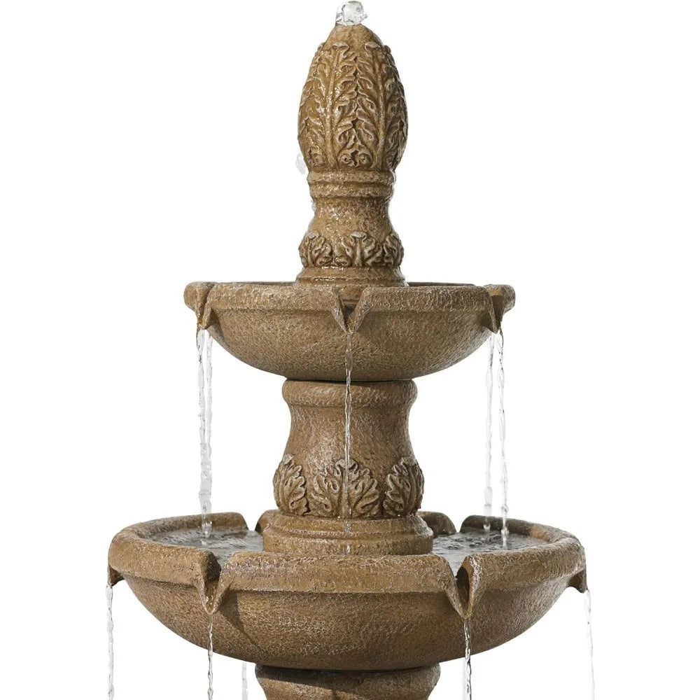 - 【Transform your outdoor living spaces】A freestanding garden water fountain with a rustic design adds timeless elegance to your front yard. This tiered fountain combines the soothing sounds of a water fall with the charm of classic outdoor decor, creating a stunning outdoor water feature for any setting.