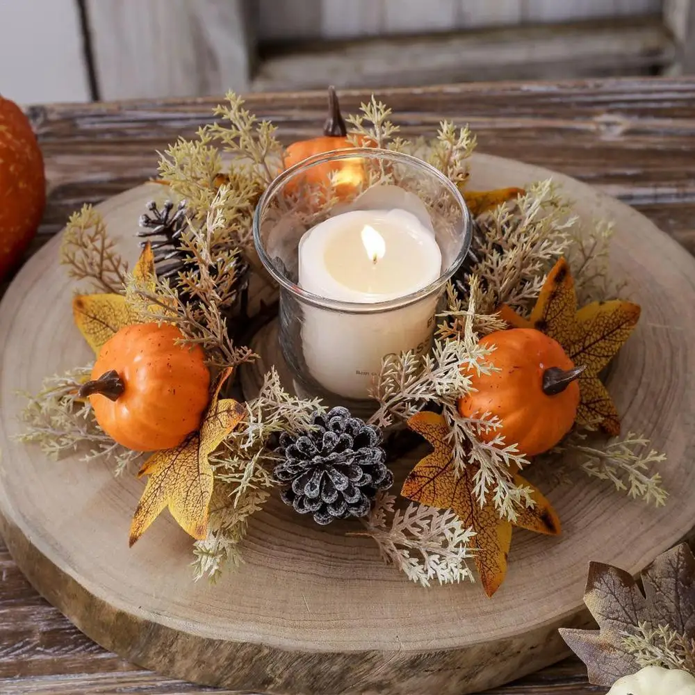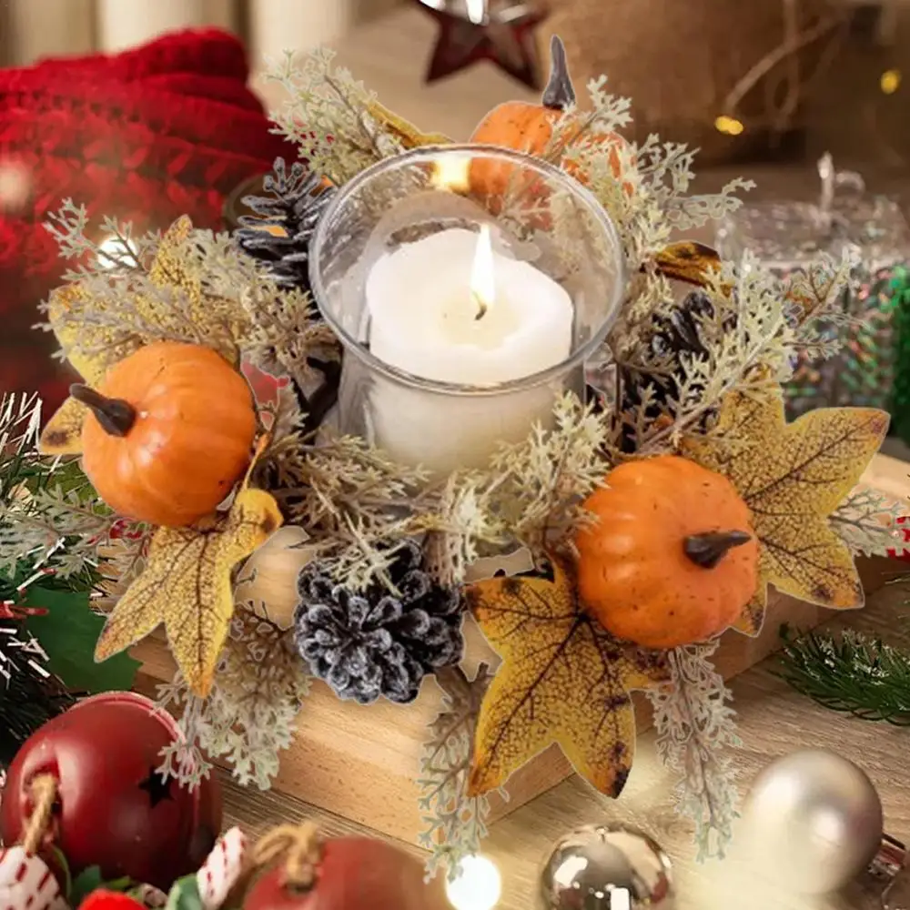 Fall Candle Ring 9.8Inch Maple Leaves Harvest Day Wreath Ring Holder Small Wreath Pillar Candle Holder Farmhouse Wreath Festival