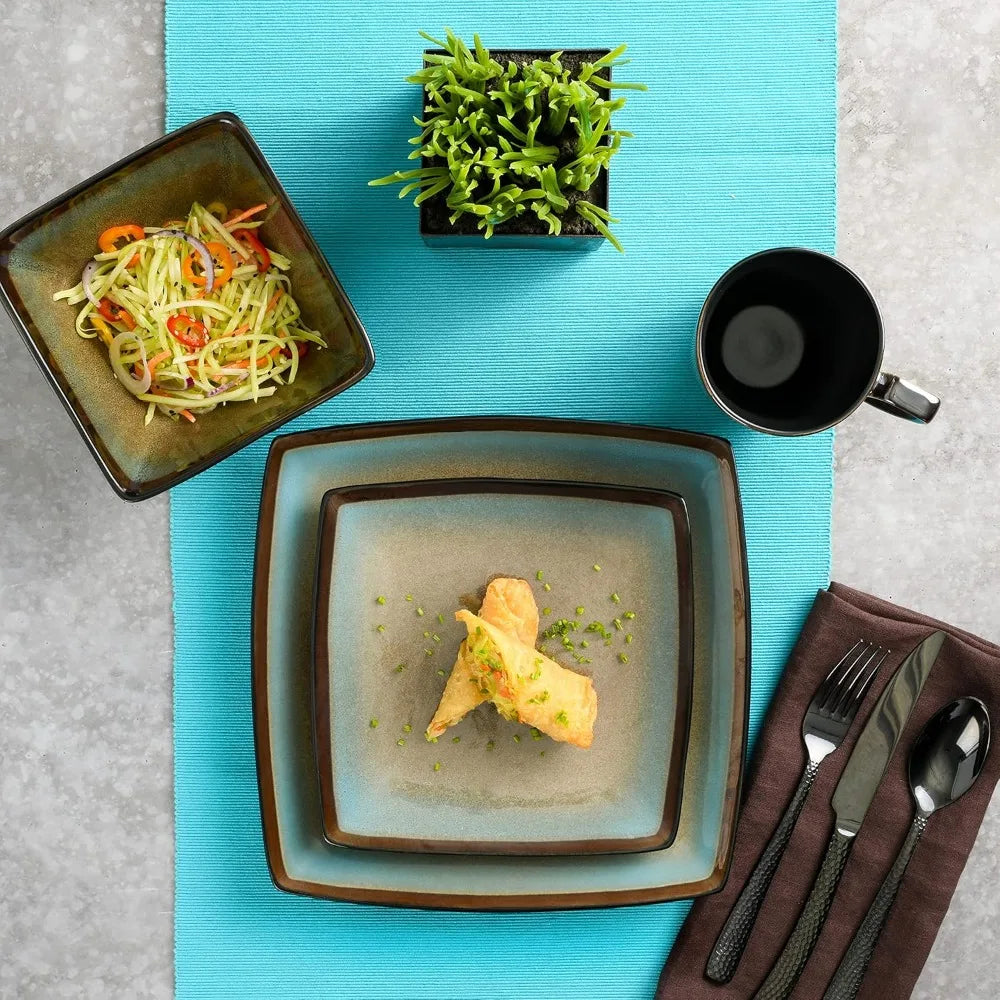Gibson Elite Tequesta Square Reactive Glaze Stoneware Plates and Bowls Dishes Dinnerware Set, Service for 4 (16pcs), Taupe