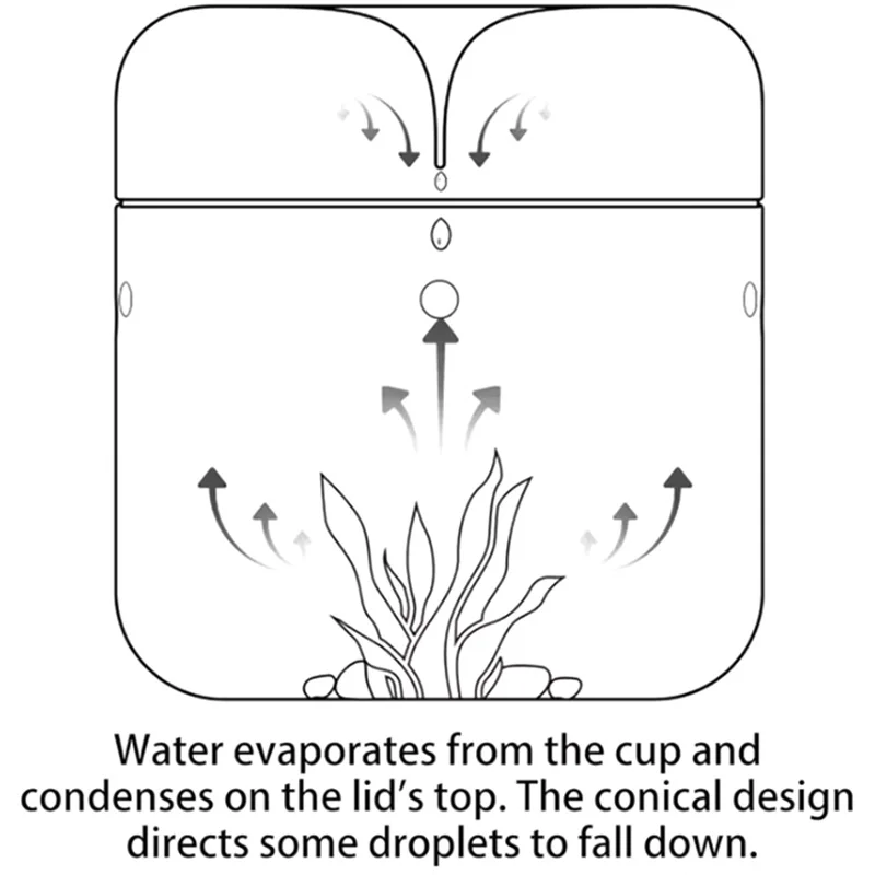 Unique Lid Design: The glass lid features a cone-shaped droplet-catching design. After water inside the cup evaporates, it condenses at the top of the lid, and the cone-shaped design in the middle of the lid guides some of the water droplets to fall down.