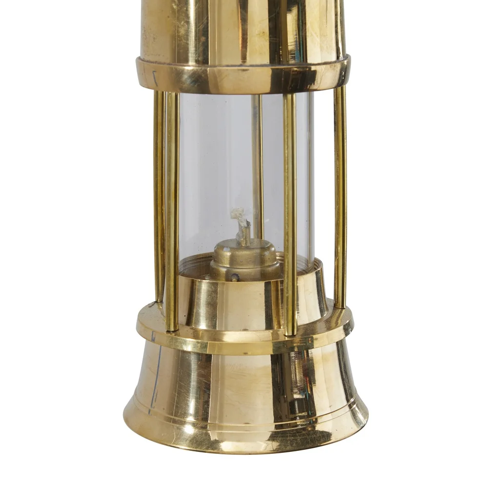 Clear glass cylinder is attached to the brass lantern frame with gold finish