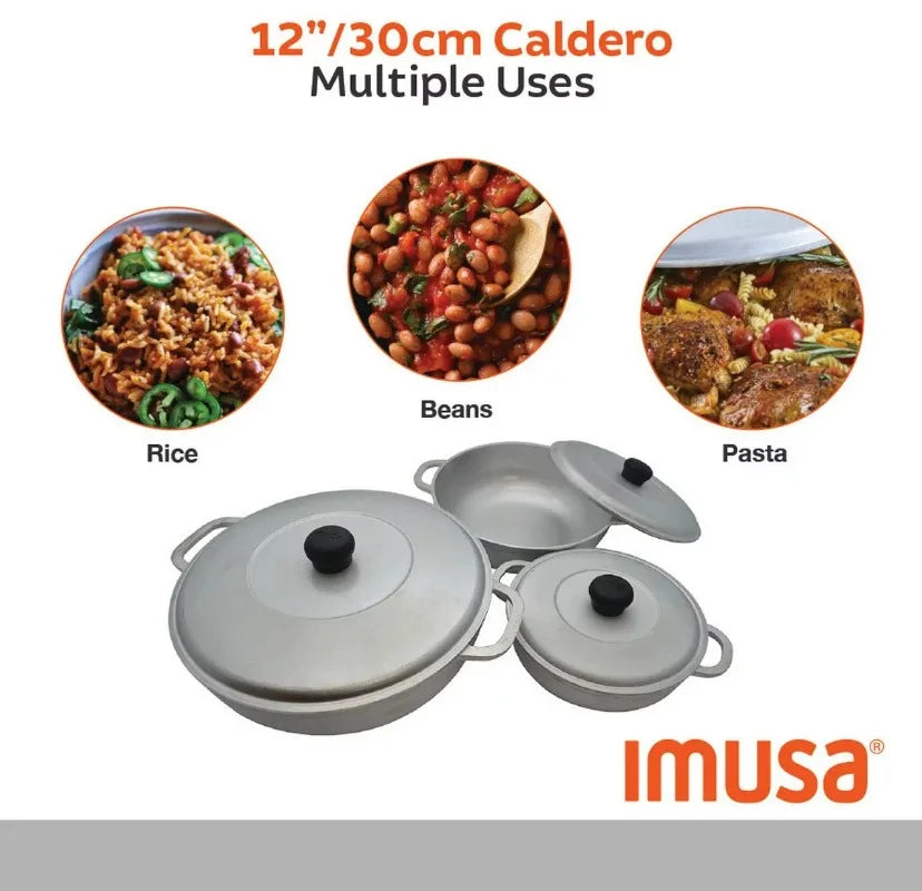 The IMUSA caldero is the workhorse of any Hispanic kitchen due to its versatility and unique design. The caldero (or cauldron in English) has rounded sides, a tight fitting lid, and superior heat distribution. Calderos are used to cook rice, beans, braise meat, and simmer stews and soups. Made in Colombia these traditional calderos will be part of your kitchen for many years to come. The rounded side heat up evenly and quickly allowing you to cook a variety of different foods. The matching lid is ideal to lock in flavor while cooking and the caldero can be used as a serving dish after cooking. This caldero (or cauldron) is an excellent addition to any kitchen and is ideal for simmering, braising, boiling, and all sorts of cooking, and features a tight-fitting lid that seals in aromas, flavors, and moisture. This caldero has a natural finish that becomes seasoned after use, imparting more flavors than nonstick pots. Lightweight aluminum construction ensures quick and even heating, plus the open pot is oven safe for broiling and finishing dishes.