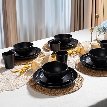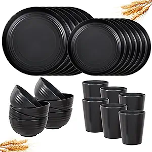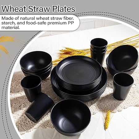 Liyh 24Pcs Wheat Straw Dinnerware Sets Unbreakable Dinner Plates And Bowls Set Bla Plastic Dinnerware Set Lude 12Pcs Wheat Straw Plates 6Pcs Bowls 6Pcs Cups Dish Set For Kitchen&Camping