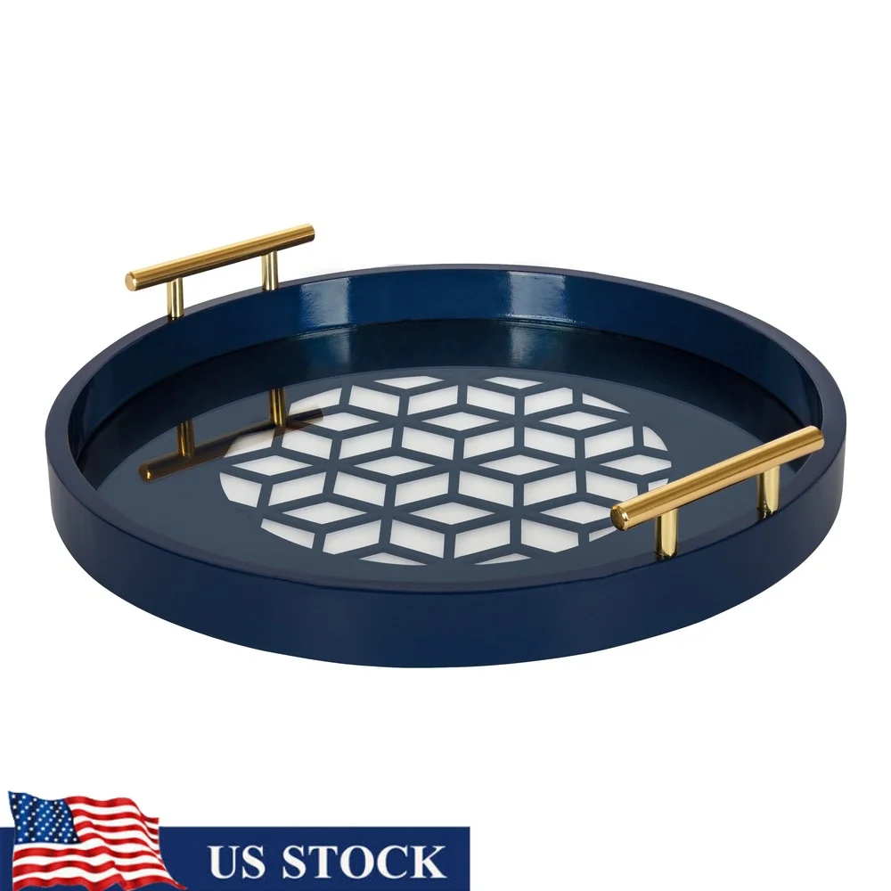 Bring contemporary glam style to your home dr with the captivating Caspen tray. This portable accent tray features a cut-out pattern on the bottom complete and polished gold metal handles. The navy blue finish is striking yet subdued to complete a glamorous dr scene and showcase your sophisticated style. With a 15. 5-inch diameter, the styling options are endless, whether you use it as a drative centerpiece or a practical way to keep track of media otes and books as an ottoman tray. This tray also looks great on your vanity to bring fashionable organization to your makeup, jewelry, and assorted creams and lotions. Its large size and functional metal handles make it a fun tray for parties, carrying your cocktails from room to room! Whether you display the Caspen on a vanity, coffee table, or countertop, its protective pads on the bottom prevent damage to any hard surface in the home. Create the centerpiece of your dreams, or add a vibrant and colorful design element to your dr with this dazzling tray.
