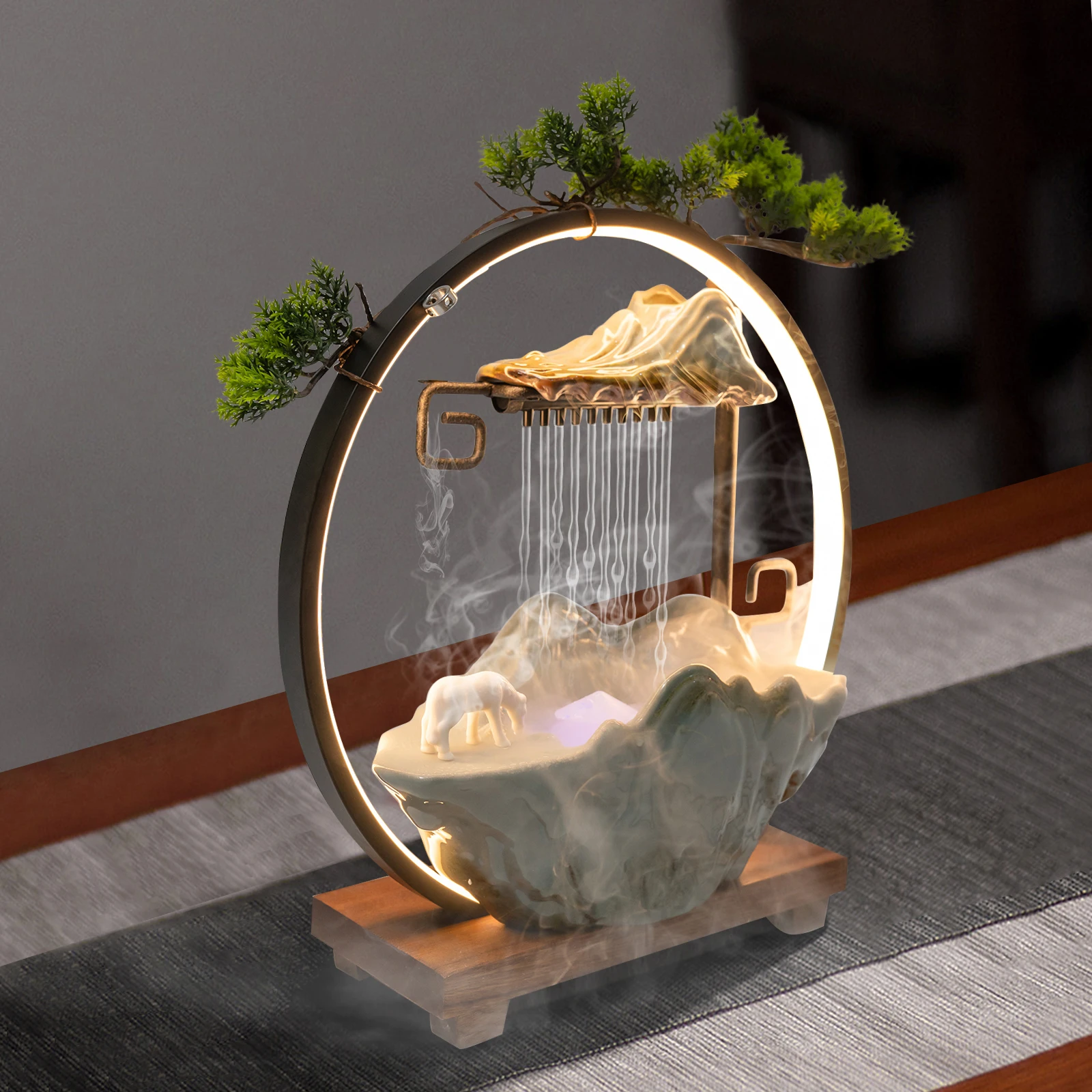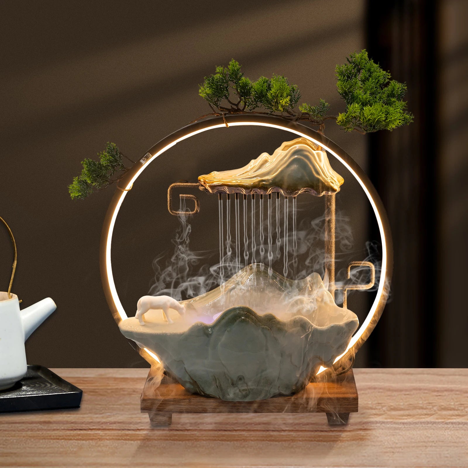 Multi-functional Tabletop Fountain with LED Light, Ceramic, Wooden Base, Pressure Relieving, Perfect for Meditation & Relaxation