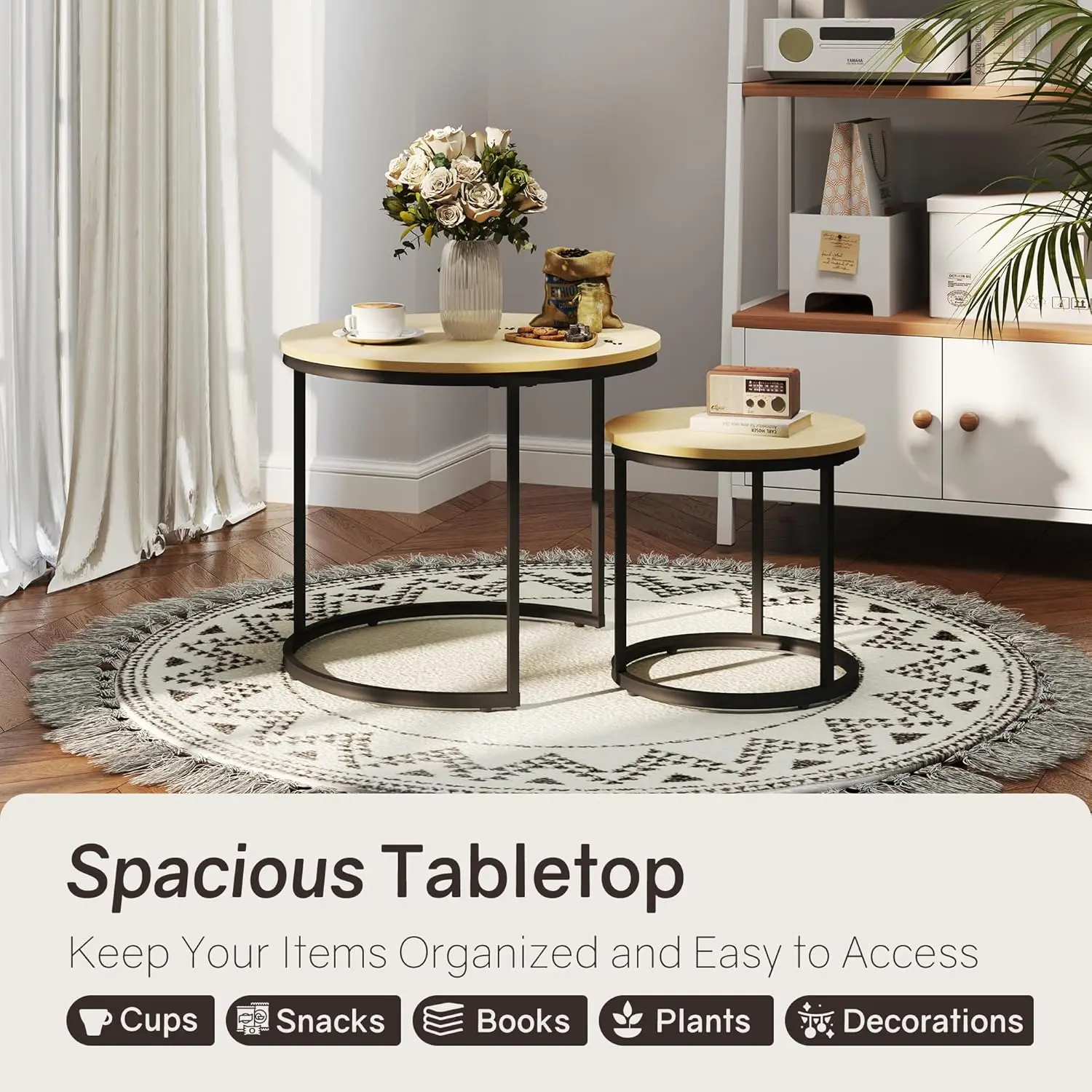 Nesting Tables Set of 2, Round Coffee Table, Small Nesting Coffee Table with Adjustable Non-Slip Fee, Wood Grain Top Nesting Tab