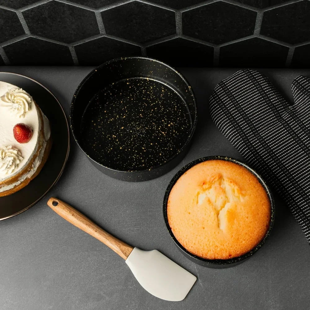 Elevate your baking with the 2-Piece Non-Stick Round Cake Pan Set. Whether you're a beginner or an experienced baker, these versatile pans make creating delicious layer cakes easy. Featuring a sleek black and gold speckled finish, they add style to your bakeware collection. The non-stick surface ensures effortless cake release and quick cleanup, making baking more enjoyable.