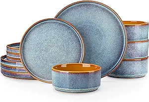 Onion Ceramic Plates And Bowls Sets, 12 Pieces Blue Dinnerware Sets For Kitchen, Reactive Glaze Dishes Set For 4, Dishwasher And Microwave Safe