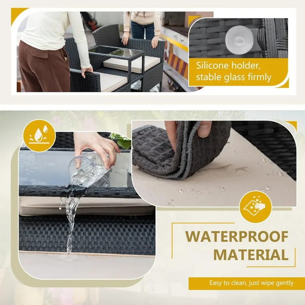 Built-in Table & Storage: In the middle of the patio loveseat integrated storage compartment and small table, you can put some drinks, snacks, fruits within your reach in the tempered glass top. The small storage space below you can put books, tea cans and etc. This design saves your space and add more convenience.