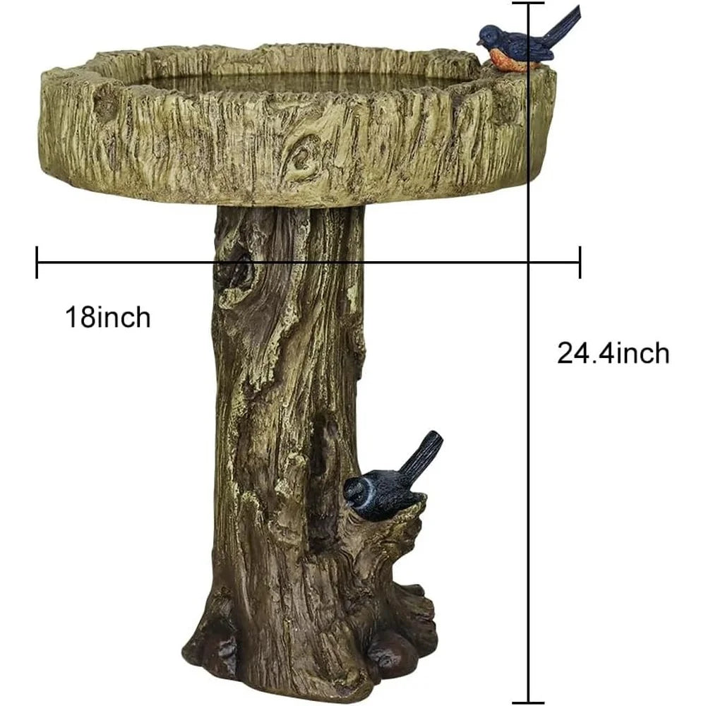 The outdoor bird bath fountains add a woodland tree trunk style touch to any outdoor space. Measures 18" in diameter x 24. 4" H overall. Ideal size make this concrete bowl bird baths serve a dual purpose as both a decorative fountain and a bird bath for outside, making it a functional and aesthetically pleasing addition to your outdoor space.