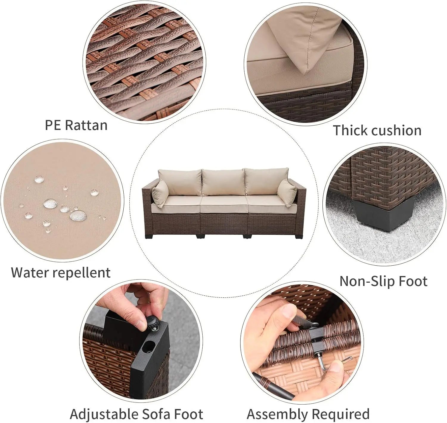 HIGH QUALITY: This 3-Seat couch is constructed from rust-resistant steel frame and all-weather PE rattan, which is sturdy and durable, can ensure it used for a long time.
