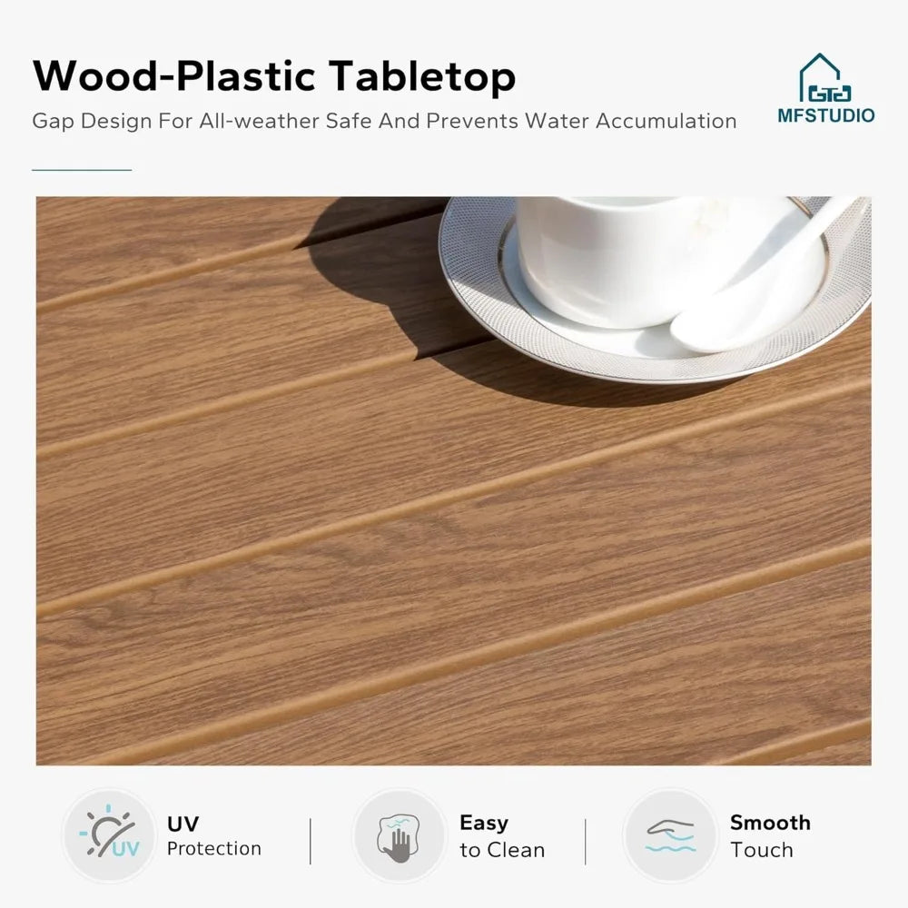 - DUAL STORAGE TABLE - Designed with a 15mm thick polymer wood tabletop, patio table is UV resistant, durable, all-weather and easy to clean. The practical dual storage design provides the table more space, with the upper tabletop storing snacks, drink coasters, and the lower shelf at the bottom providing additional storage