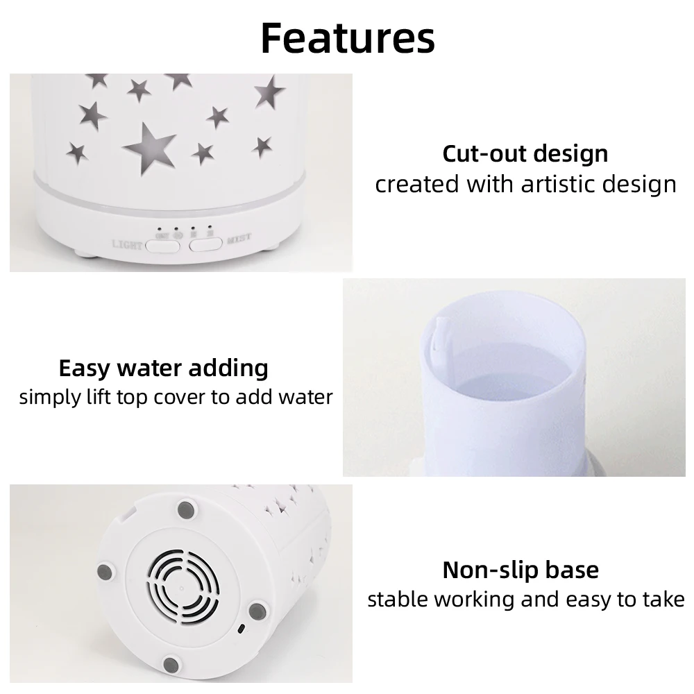 To provide a better life for you, this diffuser maintains an optimum humidity level around 50% for you and your family at home since this aroma mister is designed with the most advanced ultrasonic cool mist technology which can evaporate oil and water at a frequency of 2.4MHz.