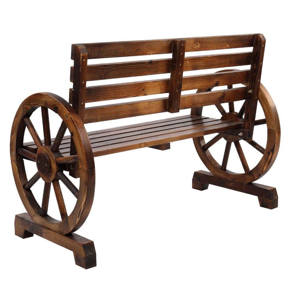 Complete your patio or garden area complete with this Rustic 2-Person Wooden Wagon Wheel Bench! The two armrests feature unique wagon wheel design, creating an eye-catching outdoor spot anywhere it stands. Crafted from solid fir wood with a dark brown finish, it is sturdy and durable enough to last for years. A large slatted back and seat make this bench a comfortable place to rest on. Wide seat allows for 2 people to sit and relax. It will surely become a staple in your garden.Features: