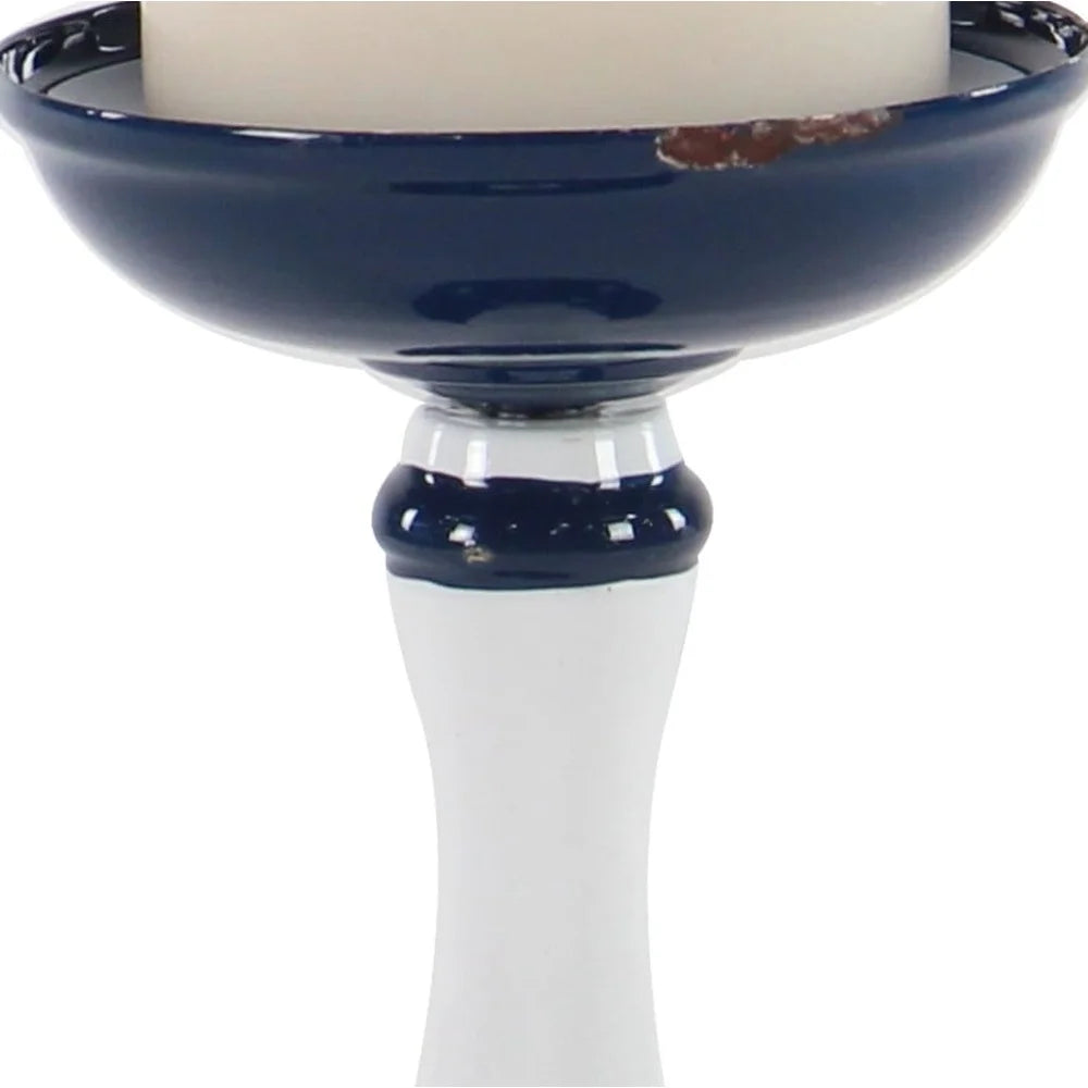 Set of 3 Rustic 8", 10", and 11" white and blue metal candle holder in a textured iron finish, flaunts asymmetrical-shaped body, small opening, and solid round base, crafted with iron