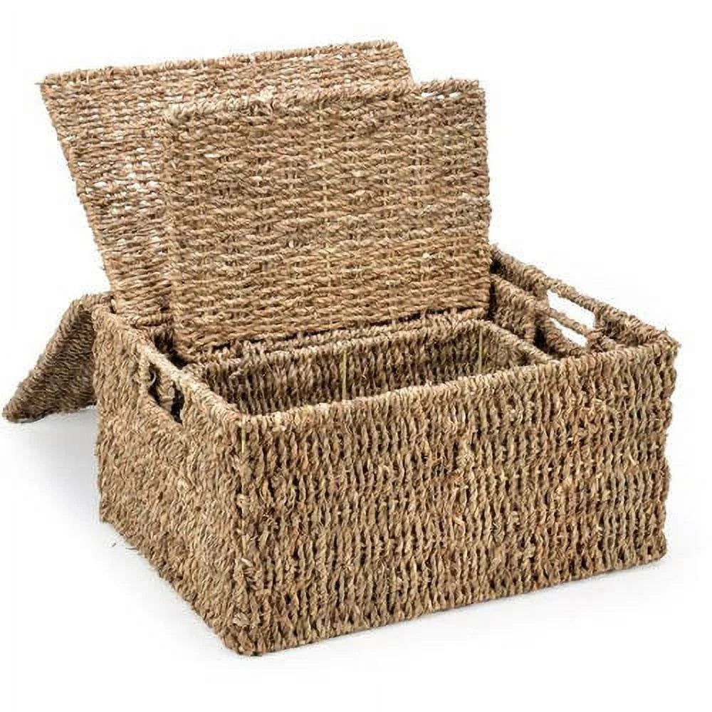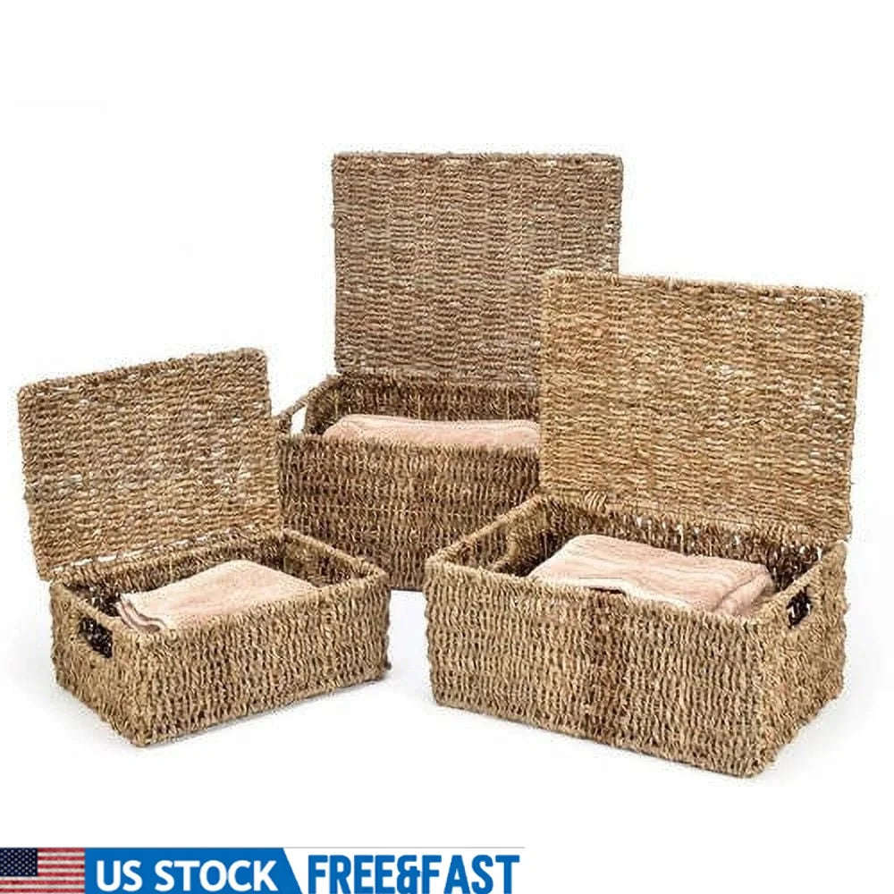 Set of 3 Seagrass Storage Baskets with Lids Decorative Wicker Bins Home Organization with Handles Perfect Storing Clutter