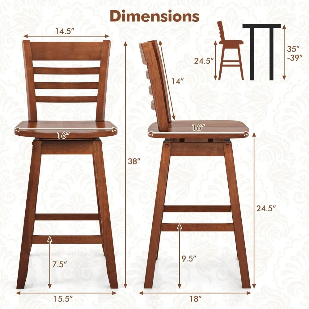 This product features a set of two counter height bar stools that offer a comfortable seating experience. The stools are designed with an ergonomically curved backrest and a contoured seat, providing essential support for your back and hips, which helps to alleviate fatigue during extended periods of sitting. They also include a built-in footrest for added comfort. The stools have a 360-degree swivel seat, allowing for seamless conversation and effortless turning, making them perfect for lively family gatherings or entertaining guests at home bars. Constructed from solid rubber wood, these stools are crack-resistant and can support up to 275 lbs, ensuring daily use without compromising stability. The chic, hollowed-out backrest design of these bar chairs complements a variety of interior styles, making them suitable for bistros, cafes, and home kitchen counters. They are easy to maintain, with a smooth wooden surface that cleans easily. With a seat height of 24.5 inches, these stools are ideally paired with counter height dining tables or bar counters ranging from 35 to 39 inches.