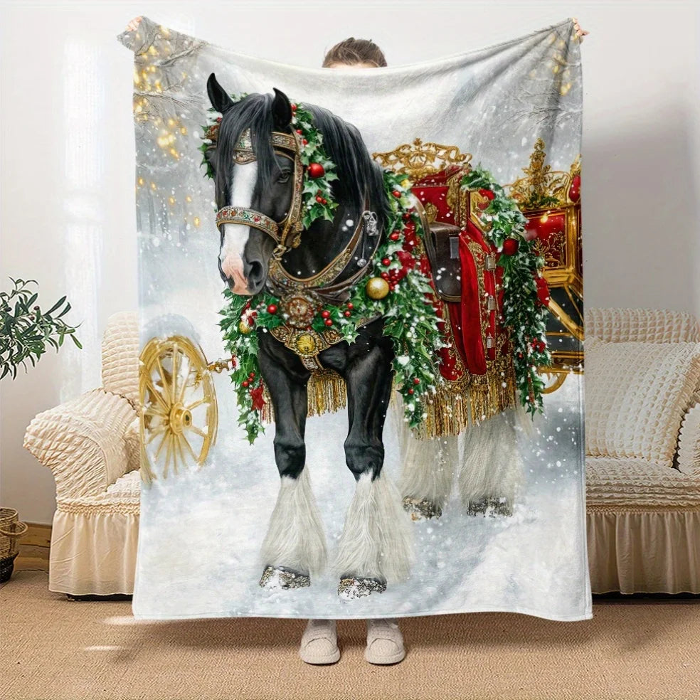 Soft and Warm Festive Christmas Horse Print Fleece Blanket - 1pc, Lightweight Flannel Throw for Home, Travel, Camping
